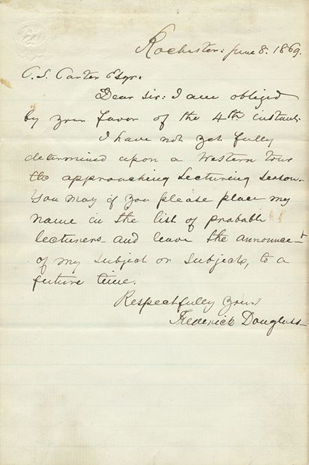(1817 - 1895) Black-American reformer born a slave, Douglass was instrumental in the creation of the Union Negro regiments which fought with great distinction during the war. A.L.S. 1p. 8vo., Rochester, June 8, 1869 to C. S. Carter, in part: "...I have nopt yet fully determined upon a Western tour the approaching Lecturing Season. You may if you please place my name in the list of probable lecturers and leave the announcem't of my subject os subjects t a future time...". Two unrelated signatures pasted to verso, else very good.
