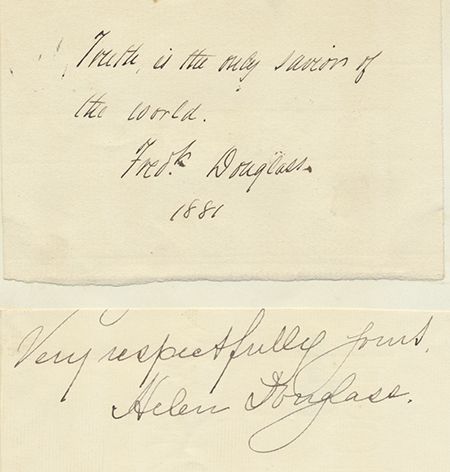(1817-1895) Black-American reformer born a slave, Douglass was instrumental in the creation of the Union Negro regiments which fought with great distinction during the war. Fine sentiment and signature beautifully penned on a small sheet: "Truth is the only savior of the world. Fredk Douglass 1881". Mounted to an album page along with a signature of HELEN DOUGLASS. Very good to fine condition.