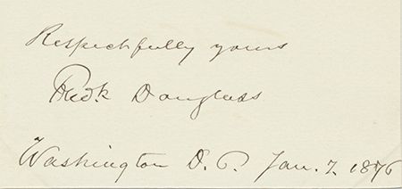 (1817 - 1895) Black-American reformer born a slave, Douglass was instrumental in the creation of the Union Negro regiments which fought with great distinction during the war. Signature on a white card: "Respectfully yours Fred'k Douglass Washington, D.C. Jan. 7, 1876". Fine.
