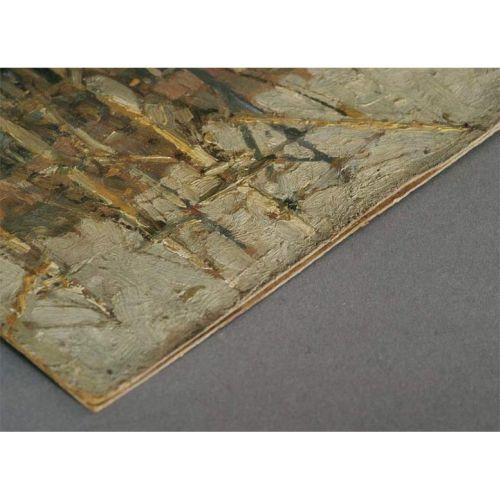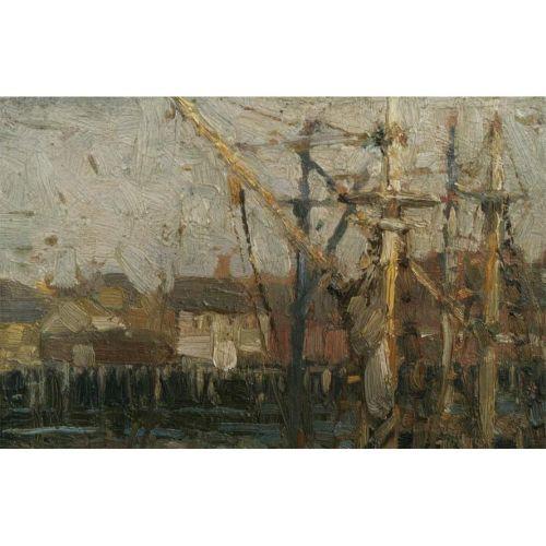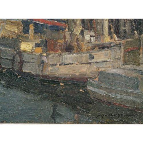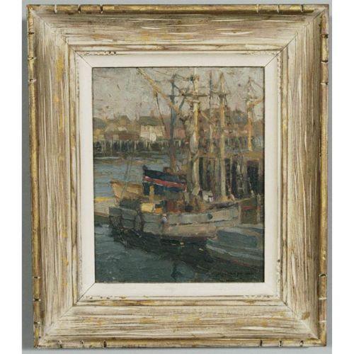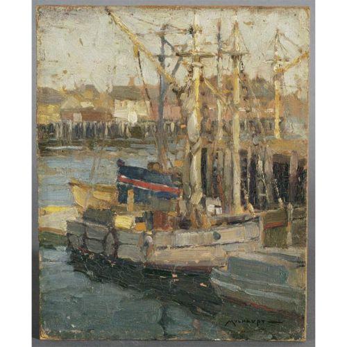 FREDERICK JOHN MULHAUPT 10"x8" oil on board fishing boats at Gloucester signed lower right CONDITION REPORT: untouched, dirty, scattered minor flakes across bottom 30 percent of image. see images.