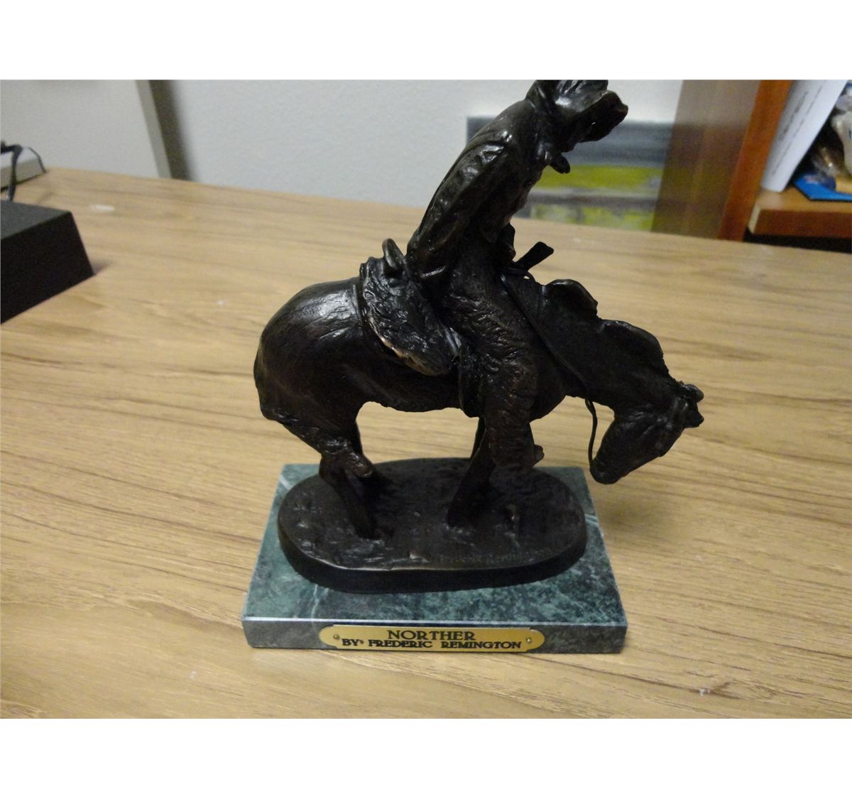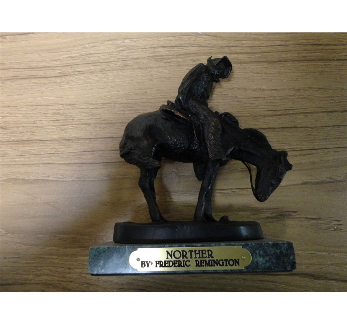BRONZE STATUE/PLUS ACT FREIGHT: EXPECTED HAMMER $225: Remington’s first bronze done in the lost wax method was The Norther. The Norther, is the fifth in Remington’s bronzes it can be thought of as a cowboy on horse back in a frigid snow storm.