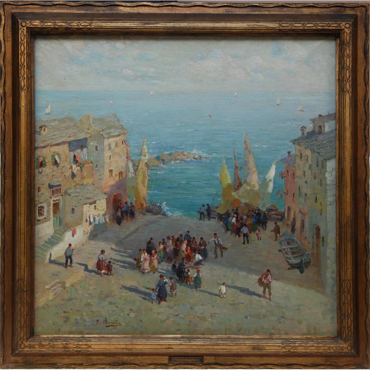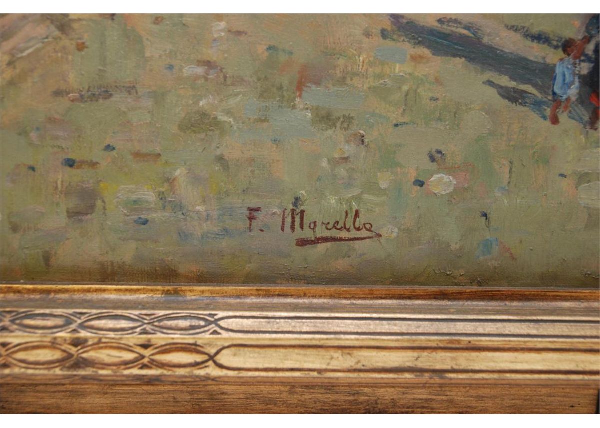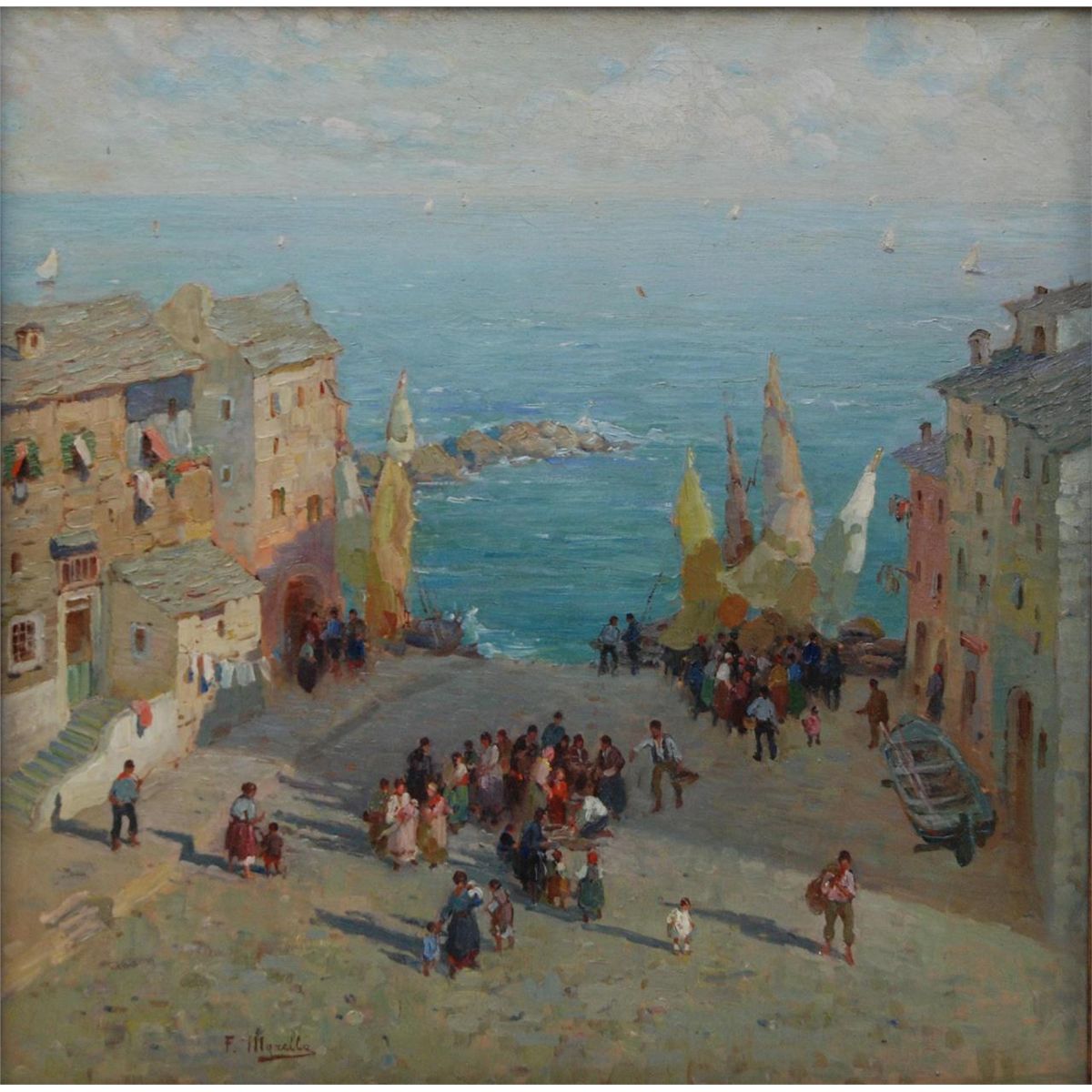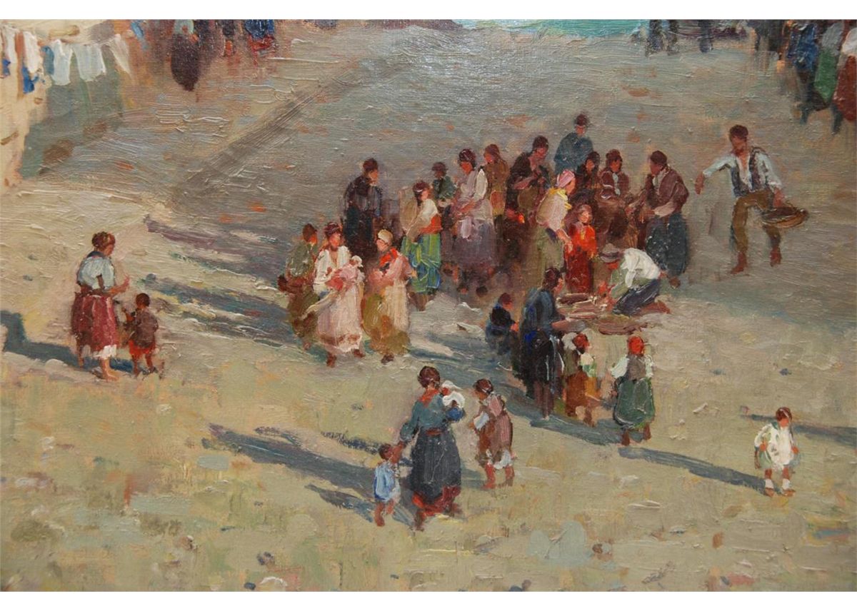 Federico Morello (ITALIAN, 1875 - 1938) oil painting on canvas depicting a coastal town street scene. Verso holds title 'VILLAGIO DEL PESCATOR (NAPOLI)'. Verso also dated 1923. Mounted in gilded frame. Measures 36" length x 36" width + 3 1/2" frame (91.4cm x 91.4cm + 8.9cm).