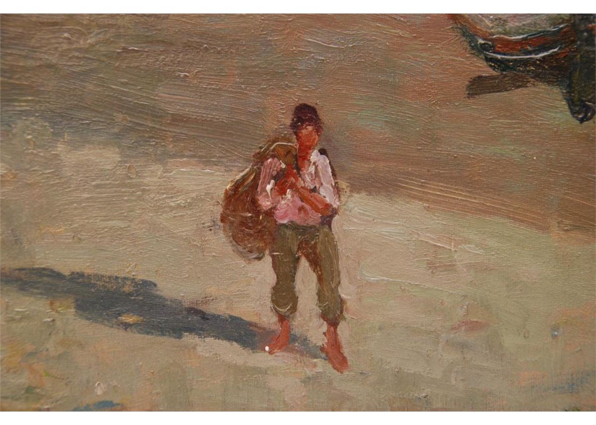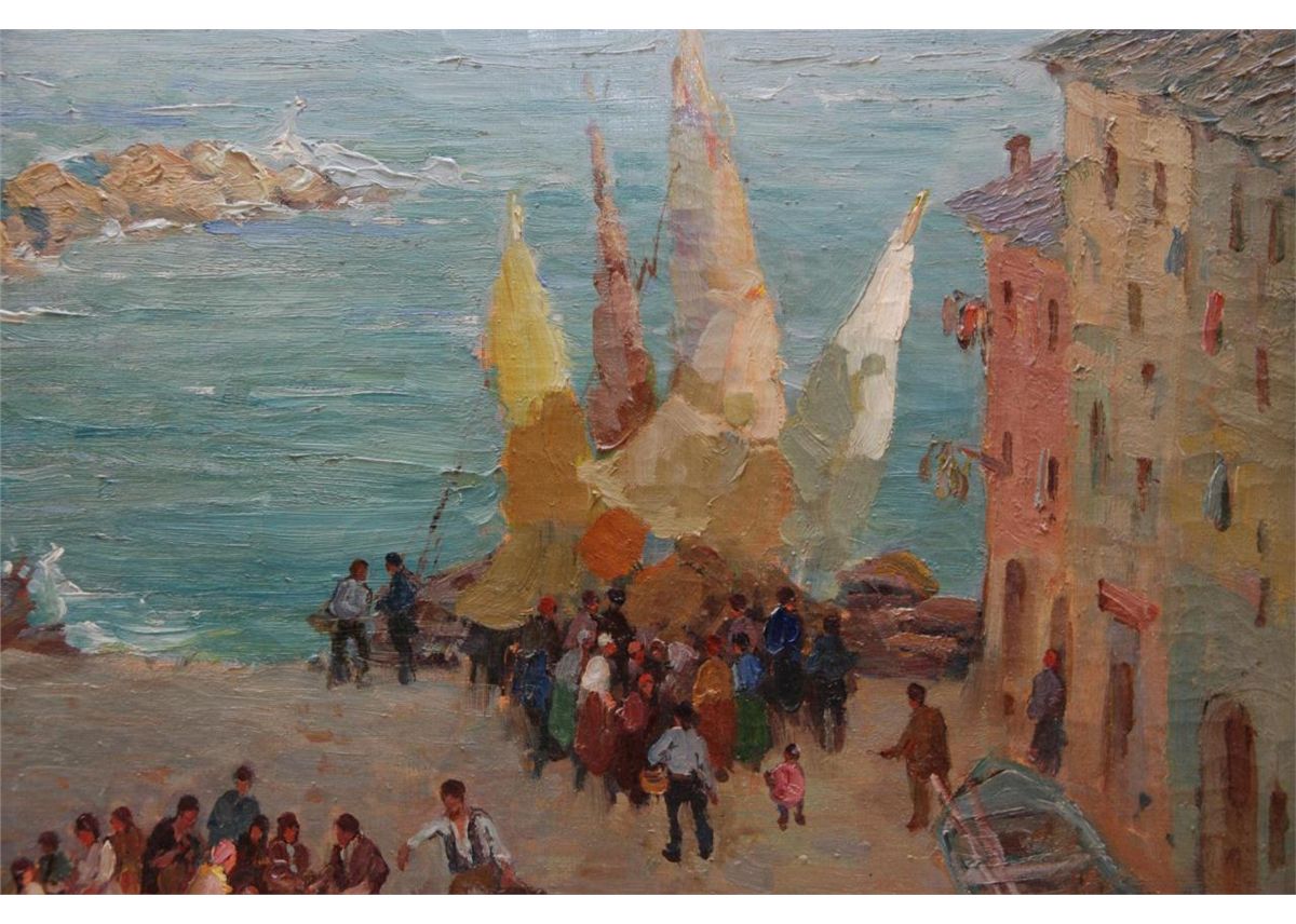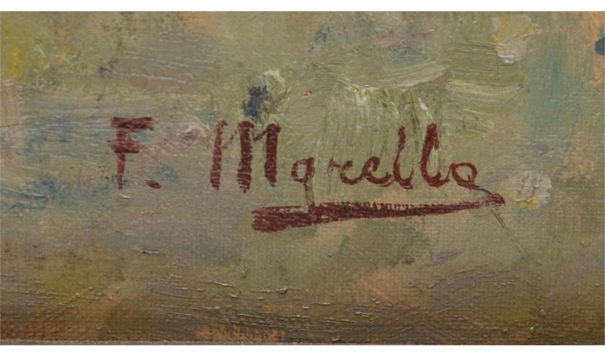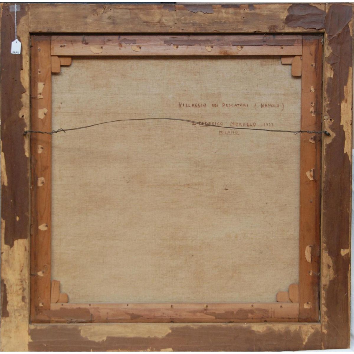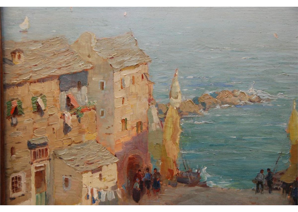 Federico Morello (ITALIAN, 1875 - 1938) oil painting on canvas depicting a coastal town street scene. Verso holds title 'VILLAGIO DEL PESCATOR (NAPOLI)'. Verso also dated 1923. Mounted in gilded frame. Measures 36" length x 36" width + 3 1/2" frame (91.4cm x 91.4cm + 8.9cm).