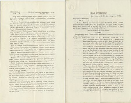 Union printed General Order No. 5, Headquarters, Beaufort, SC, Aug. 15, 1862, 3pp. 8vo., indicating: "Moses, a colored man, was convicted of murder of a negro named Juneby a mortal blow with a club and was sentenced to ten years confinement...". The same general order shows a man charged with stealing timber from a confiscated plantation. Also present is General Order No. 6, 2pp. 8vo., Beaufort, July 15, 1863, in which regulations for the establishment and operation of Plantation Commissions are set forth. These commissions were organized to adjudicate crimes committed on plantations vs. having the cases heard in military courts. Both oredrs as signed in type by Gen. RUFUS SAXTON, Military Governor.