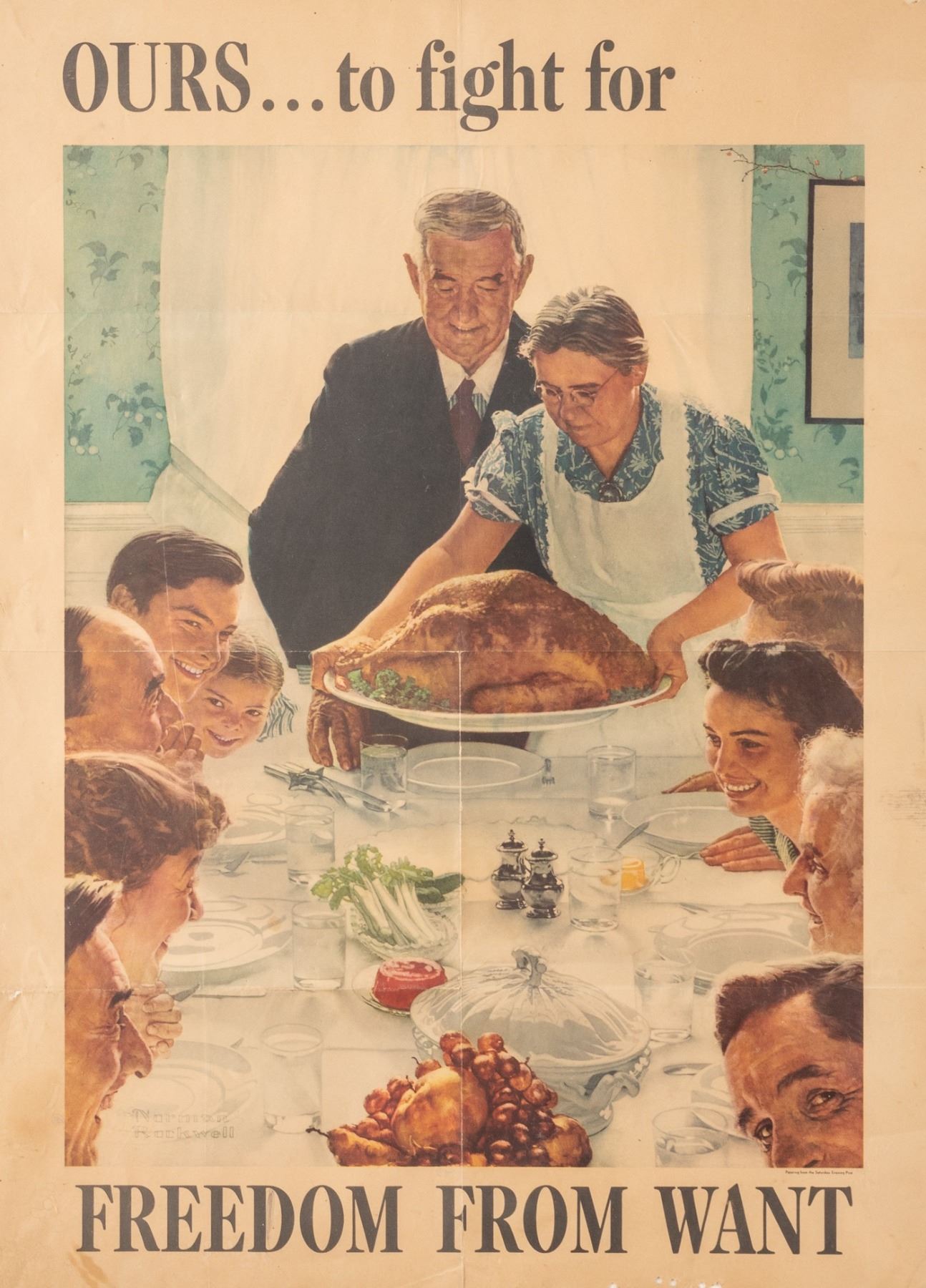 Norman Rockwell Four Freedoms poster 'Ours...to fight for - Freedom from Want', by Norman Rockwell (1894-1978), OWI Poster No. 45, U.S. Government Printing Office 1943-O-511886, 28 x 20 inches. Mailing folds. Tack holes in corners with a few punched holes on bottom edge.