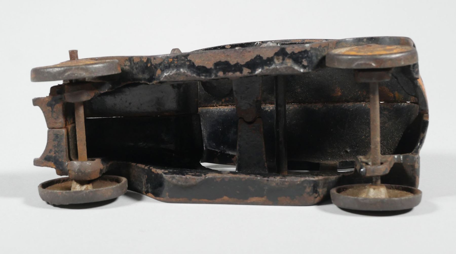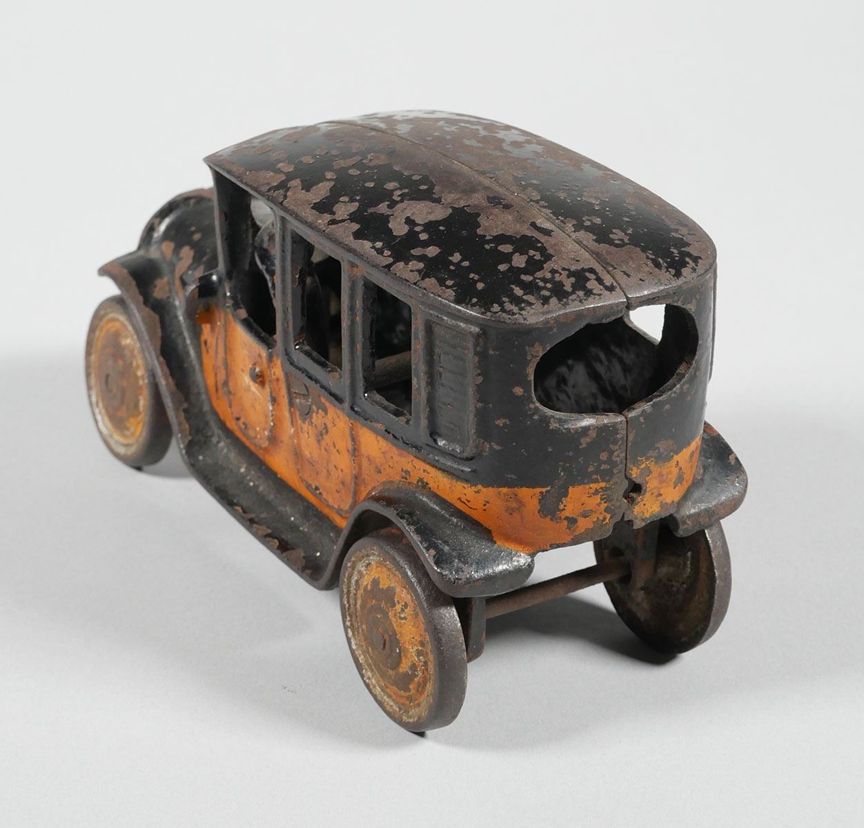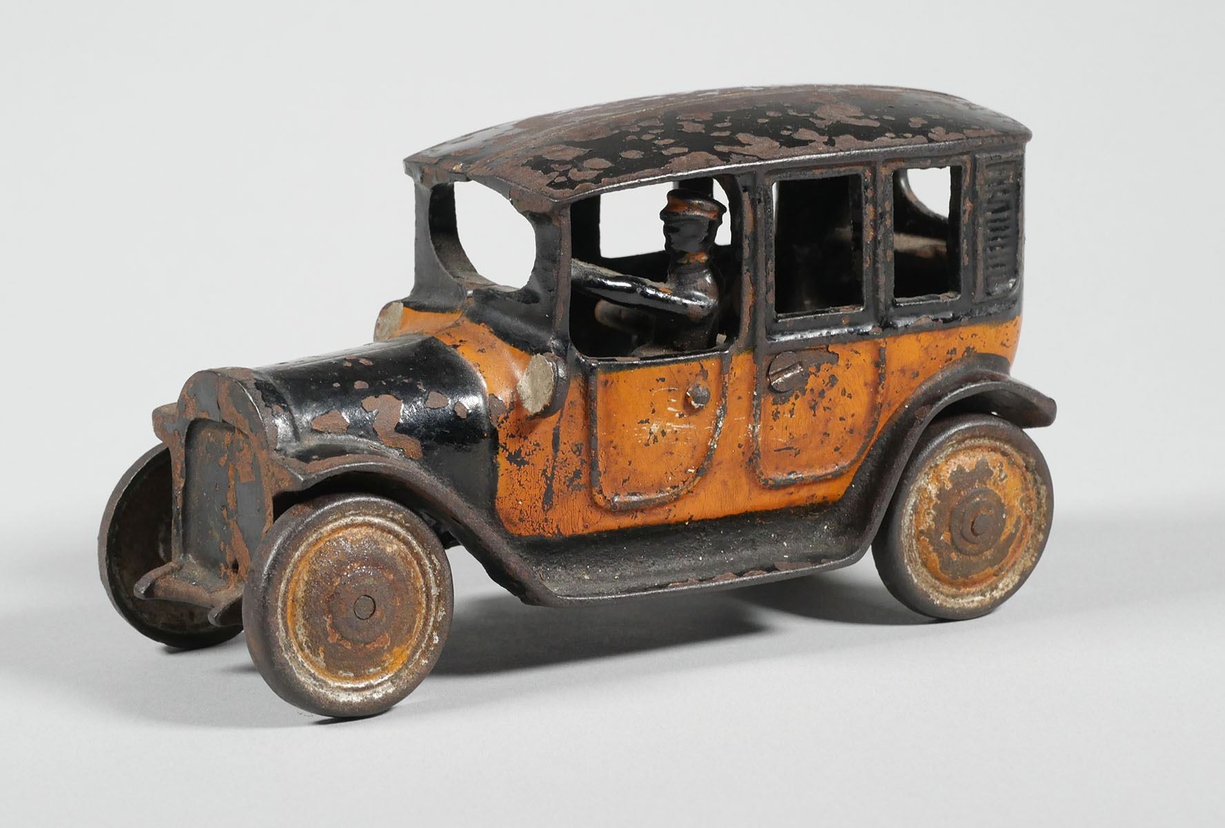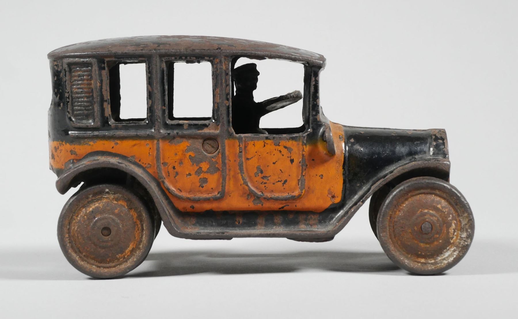 Rare antique, orange & black, cast iron Freidag yellow taxi cab with driver. Freidag made Arcade-style vehicles for only a few years in the late 1920s. Car measures 7 1/2" long. The cab does have wear, paint loss & oxidation. Cab is missing spare tire & license plate. Please see photos for more details on condition. The toys in today's auction are from a show dealer and have been in storage for over 15+ years. Some toys may require some level of cleaning and/or repair for operation.