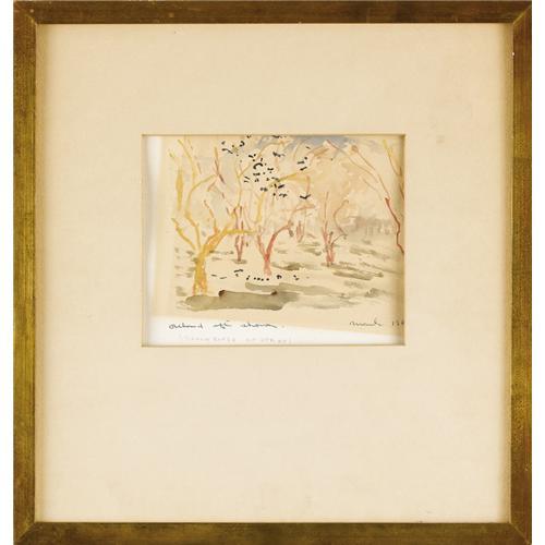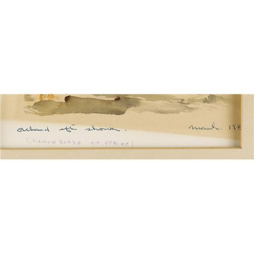 <B>FREMONT F. ELLIS</B></I> (American 1897 - 1985)<BR><I>Orchard after Shower,</B></I> March 1957<BR>Watercolor on paper<BR>5 x 6 inches (12.7 x 15.2 cm)<BR>Titled and date on lower edge<BR><BR>Provenance:<BR>Gift from the artist to the parents of the present owner<BR><BR><BR><BR><b>Shipping:</b> Requires 3rd Party Shipping (<a target="_blank" href="http://www.heritageauctions.com/common/shipping.php">view shipping information</a>)