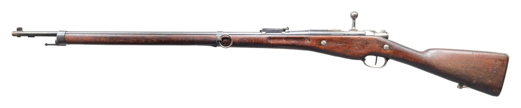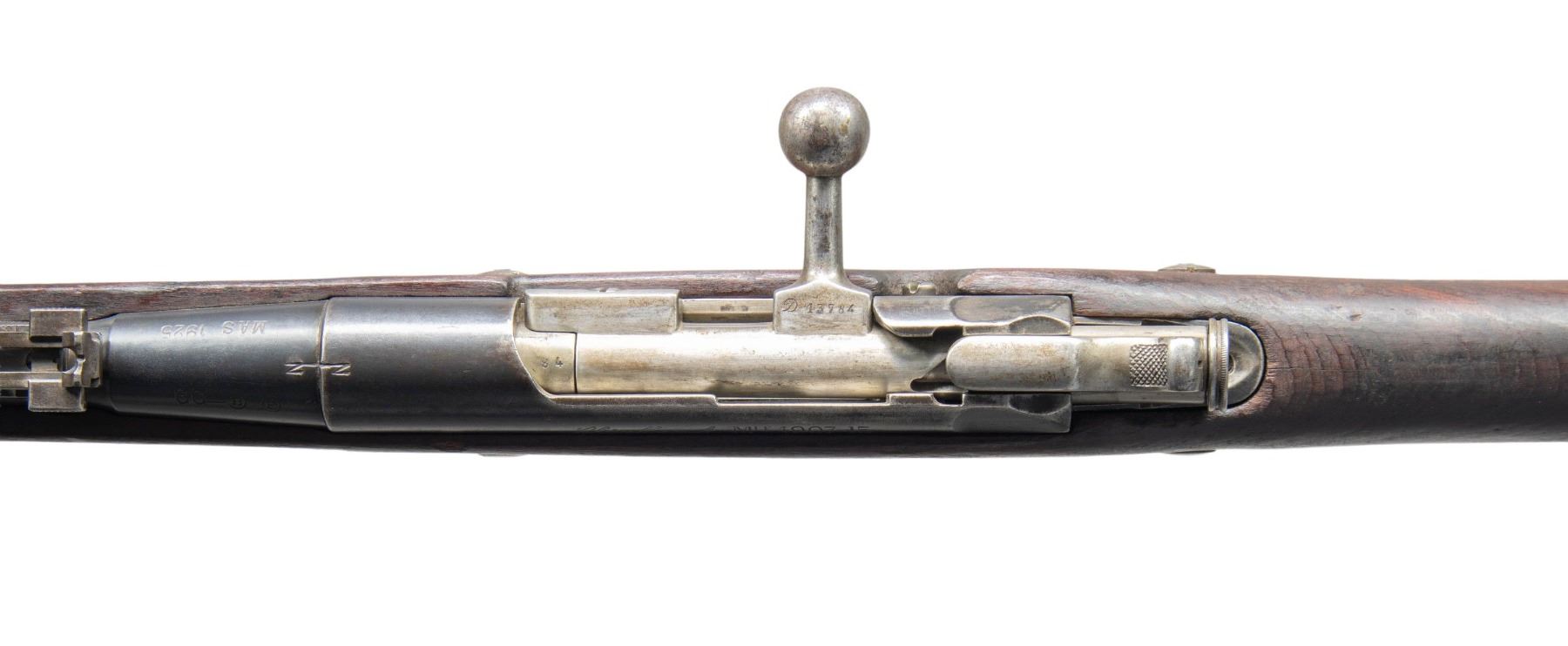 Cal. 8mm Lebel. S# D13784. Bbl. 31 1/2". Blade front sight. Ladder rear sight graduated to 2300m. All visible matching numbers as arsenal refurbished. 3-rd. 07-15 Berthier reworked in the interwar period. Bbl. has "N" Balle n & "MAS 1925" markings. Left side of receiver has Chatellerault markings. Arsenal rework blued finish. Beech stock set. CONDITION: stock shows a couple small cracks, a few small chips, scattered dings, gouges & handling marks. Metal retains 40% arsenal reworked blue with overall fading, scattered edge wear & oxidation. Action functions properly when hand cycled. Very good bore with strong rifling. (25-3875/MJC). CURIO. $200-400.