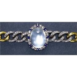 FRENCH 18K YELLOW GOLD AND SILVER BRACELET, formed of a central medallion set with a large moonstone cabochon encircled by 8 full cut sapphires (approx. 0.50ct. total weight) and 16 rose cut diamonds, on a curb link strap set with 66 rose cut diamonds, 37.9 grams