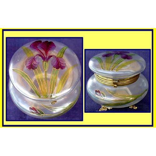 <tr><td>Title:FRENCH 19C HANDPAINTED GLASS TRINKET BOX IRIS</td></tr>