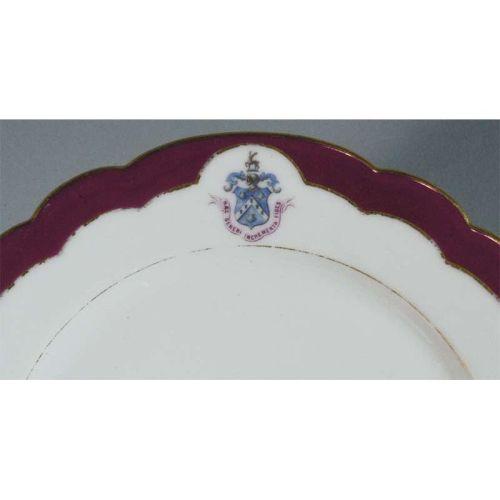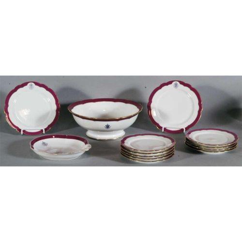 1 FRENCH ARMORIAL DECORATED PARTIAL DINNER SERVICE, marked A. Hache & Pepin Lehalleur, Vierzon, Paris (9) lunch plates, 7 1/4" (2) dinner plates, 8 1/2" and an 11" bowl 19th century CONDITION REPORT: some rubs, one small serving piece cracked, one luncheon plate with chip and age crack. PACKING AND SHIPPING (excluding insurance) by Fairfield Auction to points within the Continental U.S.A. and Canada (all other international must be handled by 3rd party shipper) $50.