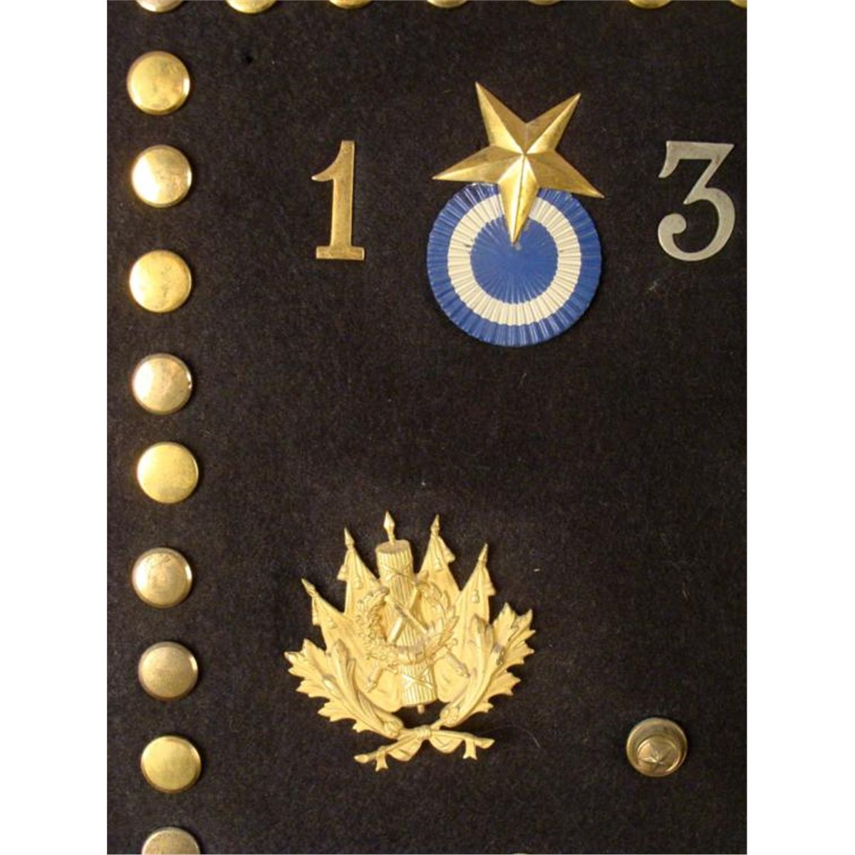 OUTSTANDING HUGE 3' X 3' FRAMED COLLECTION OF "ARMEES FRANCAISE (FRENCH ARMY) COLLECTION OF MILITARY SHAKO PLATES, BUCKLES, INSIGNIA & UNIFORM BUTTONS-CIRCA 1850-1920PROFESSIONAL DISPLAY OF ORIGINAL FRENCH MILITARY COLLECTION FROM THE FRENCH ARMIES OF YEARS GONE BY. KEPI/SHAKO LARGE MILITARY FRONT PLATES-BUTTONS AND INSIGNIA--1800'S TO APPROX 1920. FRAMED AND BEAUTIFULLY ASSEMBLED-READY FOR HANGING TO DISPLAY
