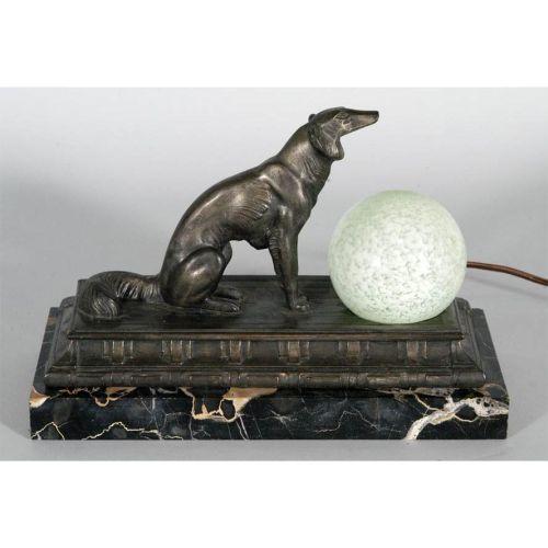FRENCH ART DECO RADIO LAMP the marble base with a cast metal dog and mottled green glass globe, 13"long, 9"high CONDITION REPORT: minor nicks to rim of shade. PACKING AND SHIPPING: We offer packing (double boxed in most cases) and shipping of this item within the Continental United States by USPS or UPS (our choice- boxes over 30lbs may be recalculated based on buyer's location), NOT INCLUDING INSURANCE (it will be added when we know the sales price) for $35