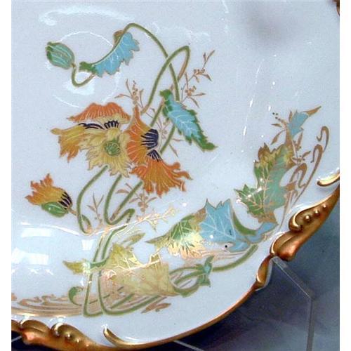 AN SPLENDED EXAMPLE OF AN LIMOGES ART NOUVEAU PLATE,BY J.POYAT.THE MARKS INDECATE THAT THE PLATE WAS MADE IN JAN. 23, 1906. IT IS A DELICATELY HAND PAINTED ART NOUVEAU FLORAL DESINGE.THERE IS NO WEAR TO THE HAND PAINTING OR TO THE GOLD GILT.THIS PLATE IS THE HIGHT OF ART NOUVEAU DESINGE.IT WILL MAKE AN EXCELLENT ADDITION TO ANY PLATE OR ART NOUVEAU COLLECTION!