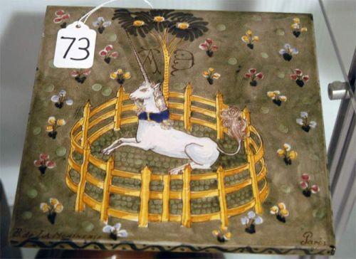 FRENCH ART POTTERY TILE, Boutal, 7"x7", signed B. de La Morinerie, with a unicorn, condition: excellent,