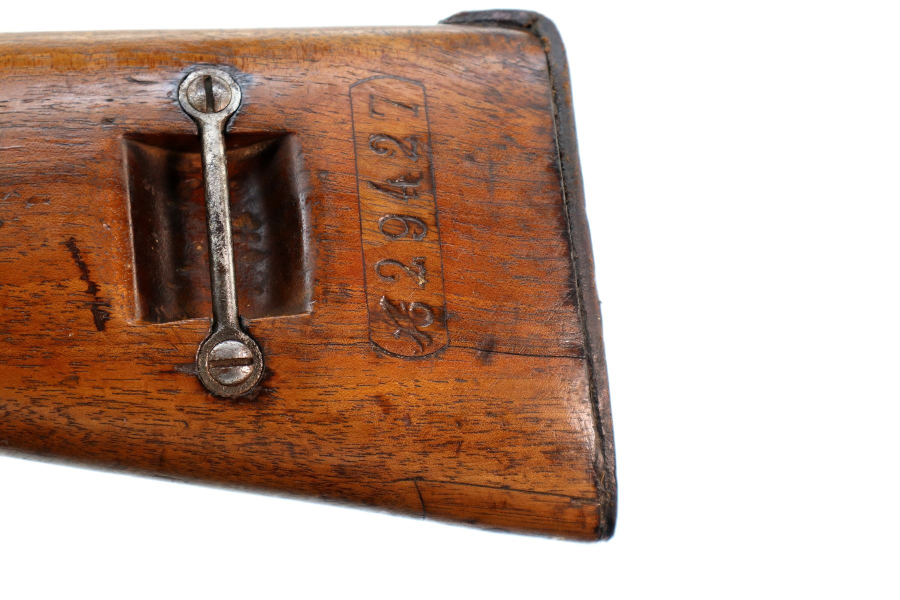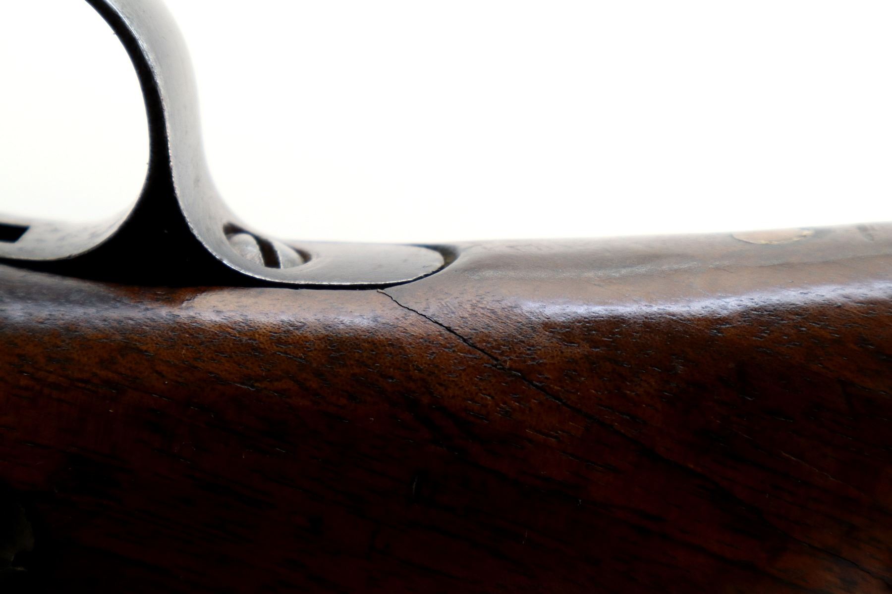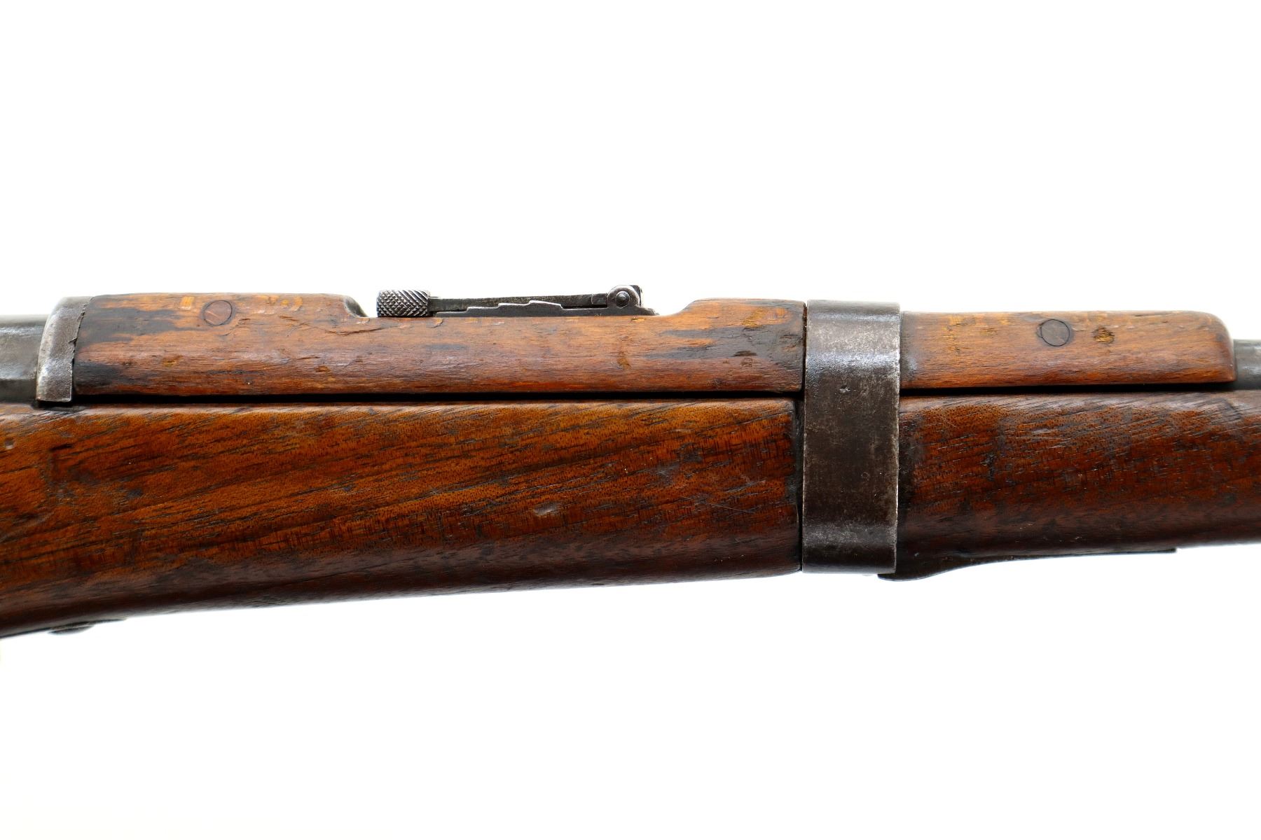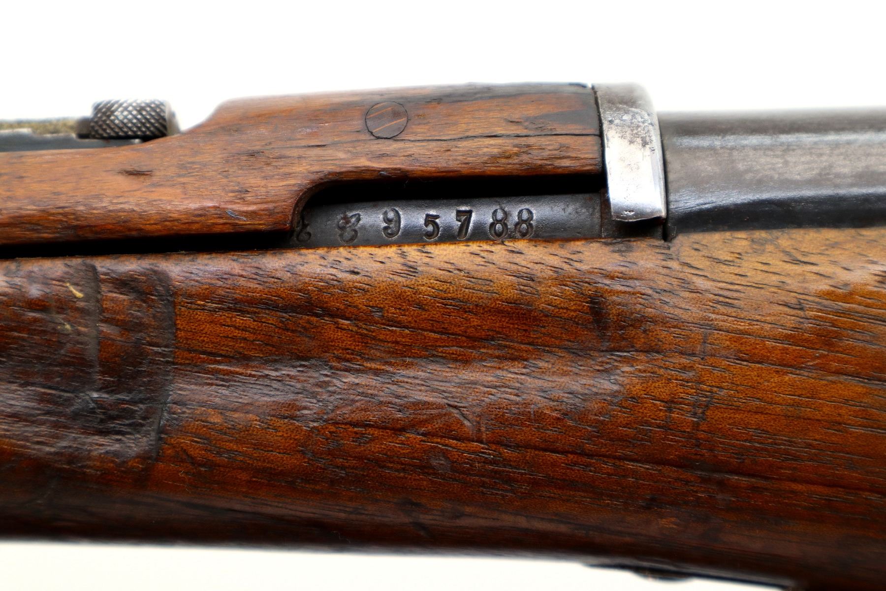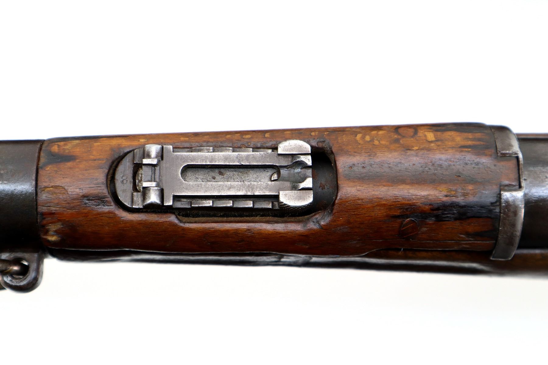Main Description: Manufactured by STS Continsouza, serial numbers mismatched. Block front sight with groove, adjustable u notched rear sight, round receiver, turn down bolt handle with flat bottomed knob. Two piece full military wood stocks, handguard is chipped and cracked, straight grip cracked and repaired through wrist, replaced black leather butt plate, stock shows various arsenal repairs, 5 round magazine, sling swivels, bayonet lug, stacking hook, missing cleaning rod.