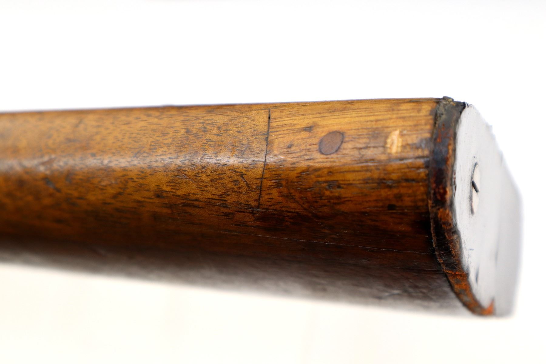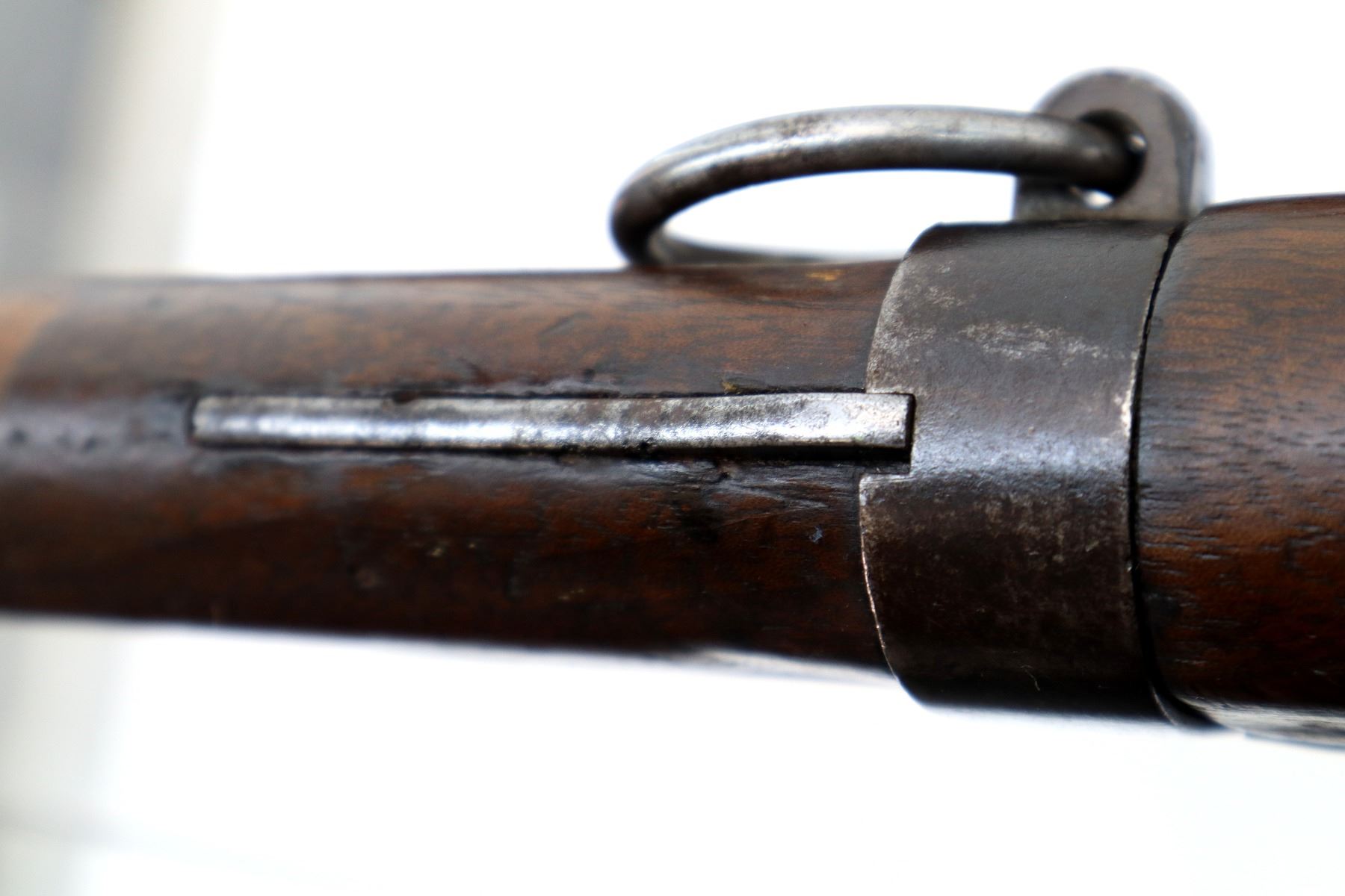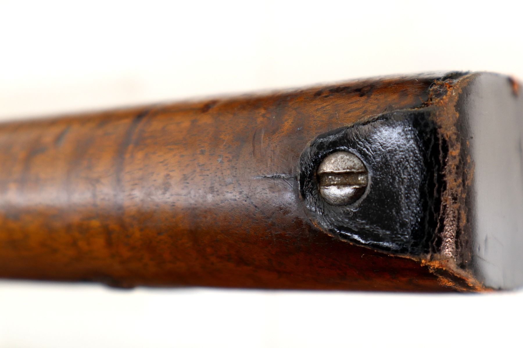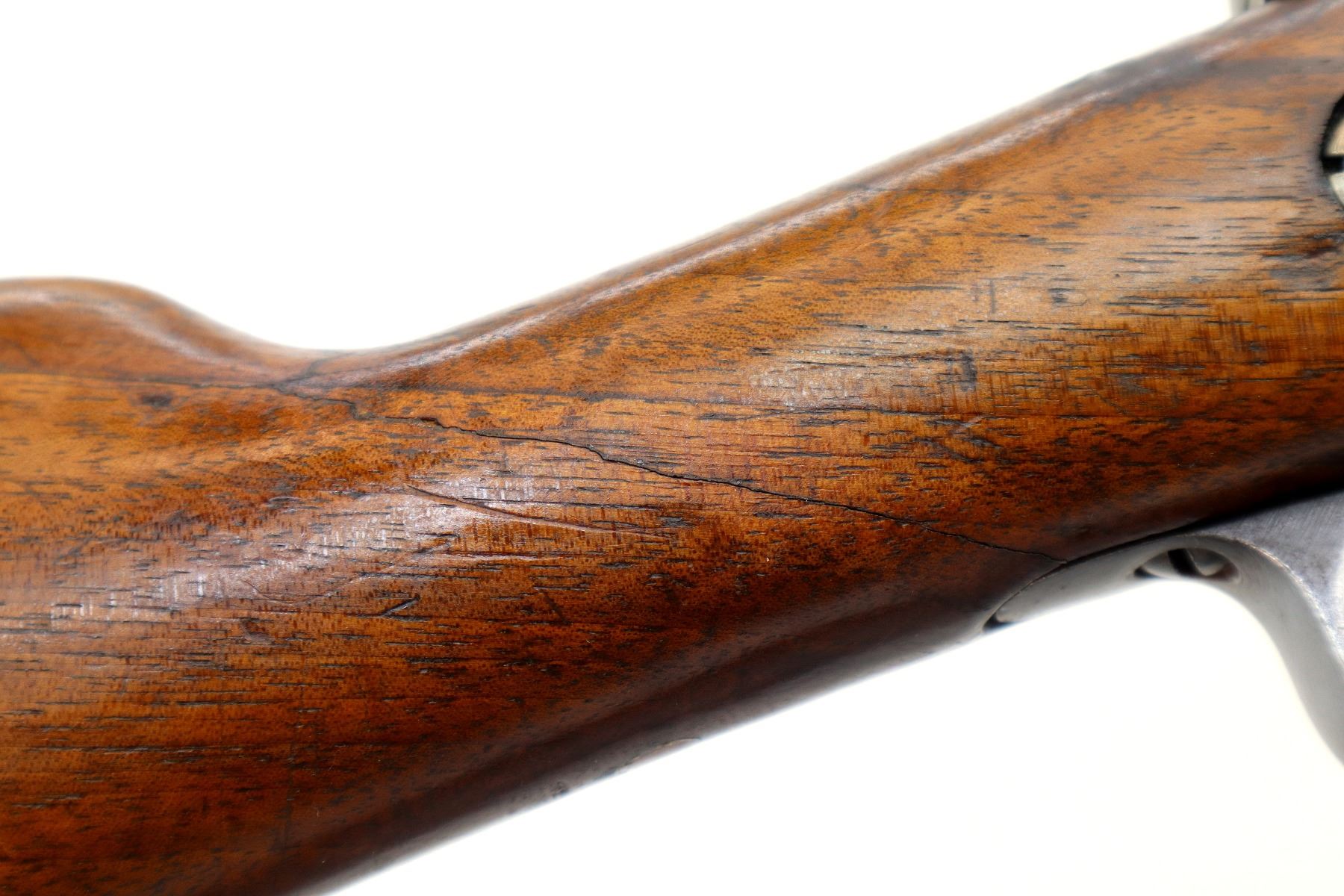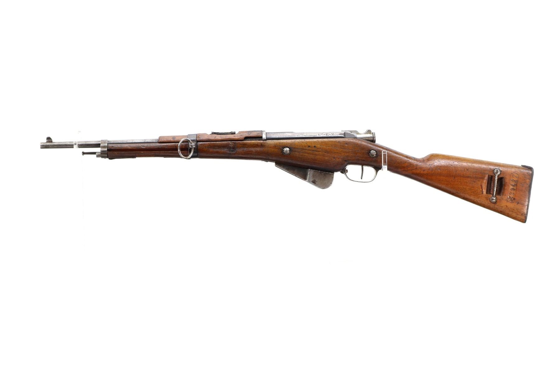 Main Description: Manufactured by STS Continsouza, serial numbers mismatched. Block front sight with groove, adjustable u notched rear sight, round receiver, turn down bolt handle with flat bottomed knob. Two piece full military wood stocks, handguard is chipped and cracked, straight grip cracked and repaired through wrist, replaced black leather butt plate, stock shows various arsenal repairs, 5 round magazine, sling swivels, bayonet lug, stacking hook, missing cleaning rod.