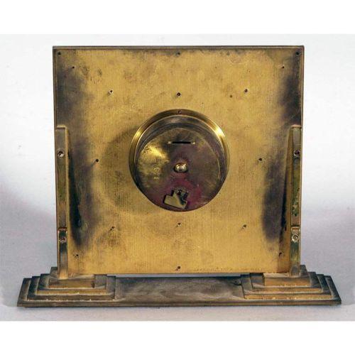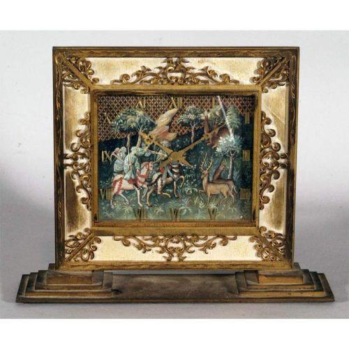 FRENCH BRONZE ART DECO DESK CLOCK with painted Persian hunt scene, 11" high, 14" wide, circa 1930 CONDITION REPORT: minor nicks and scratches, otherwise- no damage or restoration. PACKING AND SHIPPING: offered by Fairfield Auction to points within Continental U.S.A. and excluding insurance (which will be required and added) $30.