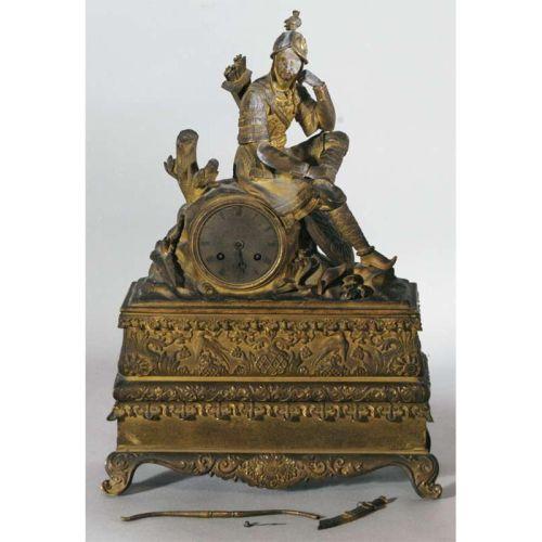 1 FRENCH BRONZE MANTLE CLOCK 19" high 19th century CONDITION REPORT: attic found, dirty surface, sword and dagger detached but present. PACKING AND SHIPPING (excluding insurance) by Fairfield Auction to points within the Continental U.S.A. and Canada (all other international must be handled by 3rd party shipper) $40.