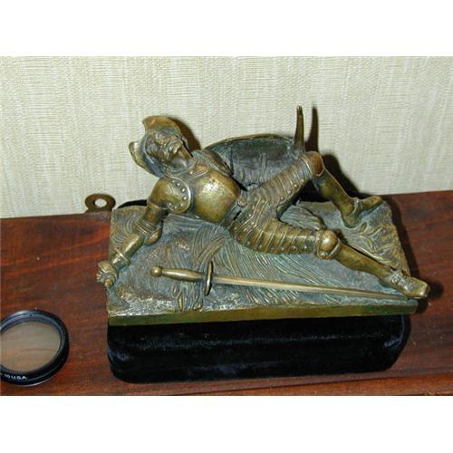 DON QUIOXOTE IS PORTRAYED WITH HIS BROKEN LANCE, HIS SWORD AND SHIELD. HE LIES ON GRASS, BEAUTIFULLY REPRESENTED IN THE CASTING. IT APPEARS THAT HE HAS BEEN WOUNDED IN THAT JUST BELOW HIS BREASTPLATE THERE IS AN INDICATION OF A WOUND.