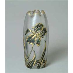 Lot 1261 FRENCH CAMEO VASE. Cameo and enamel decoration of irises and leaves with a dragonfly on a chipped ice background and crimped top. Marked on base “VIII”. SIZE: 7-1/4” t. CONDITION: Very good to excellent. 5-68652 (600-800)