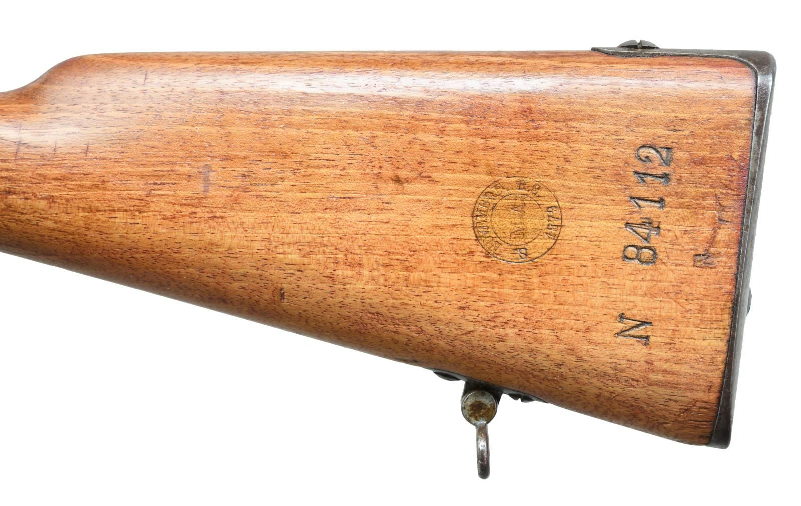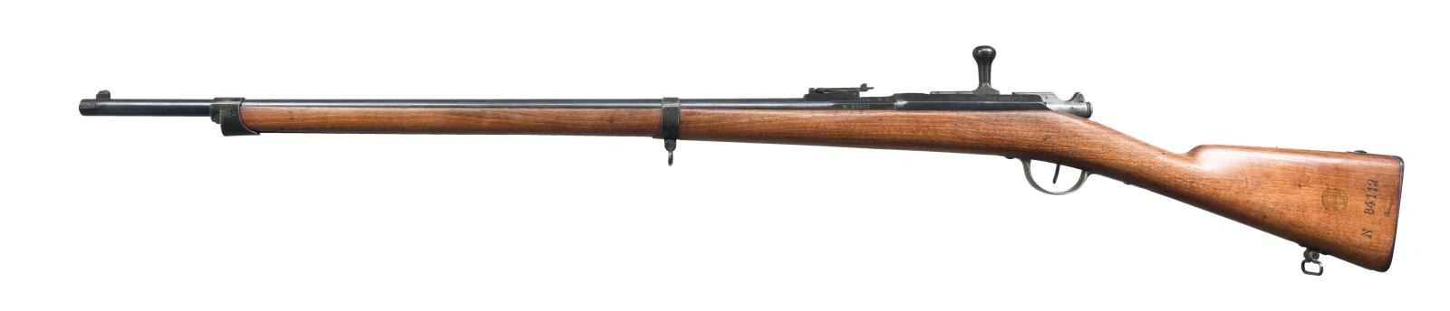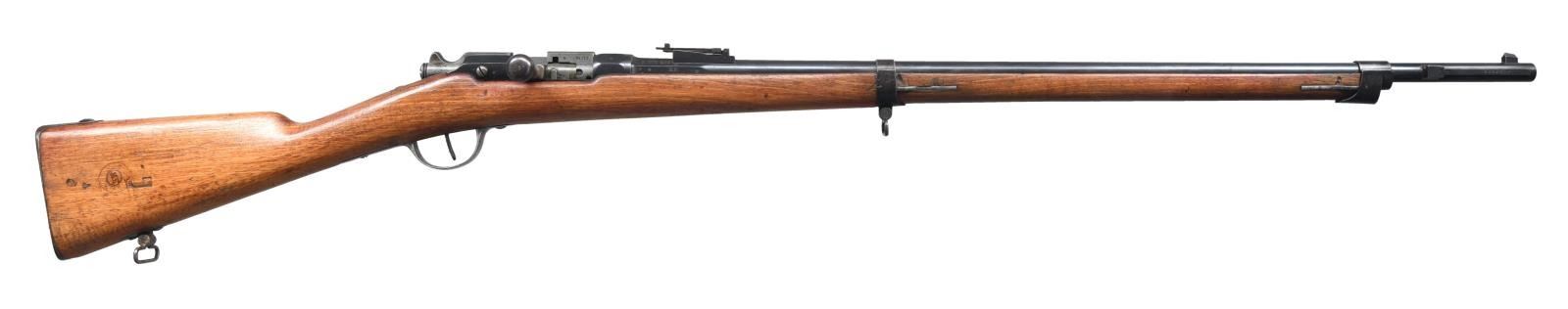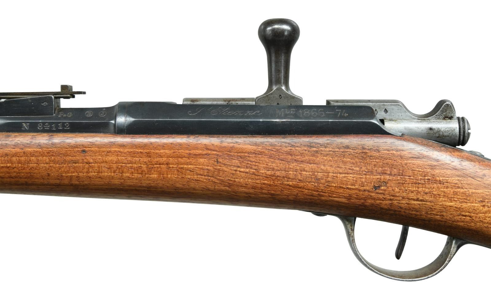 SHOT BOLT ACTION MILITARY RIFLE. Cal. 11mm Gras. S# N84112. Numbers match on bbl., bolt assembly, stock & bayonet bar. 32 1/4" bbl. Ladder rear sight graduated 1700 yards. Inverted V front sight. Receiver is marked on left side "St. Etienne MLE 1866-74". The bbl. which has the chamber insert to convert from the Chassepot paper cartridge to the metallic Gras cartridge is marked on the top right flat "S. 1872 C. 79" & marked on right flat "ME" which is the St. Etienne arsenal marking. European walnut stock. Stock is marked on right side w/ roundel which has been obscured except for the central wooden plug which is stamped "ME". Left side of stock has roundel marked outside "NOVEMBRE S.VC. 1879". The center is marked "MA". This marking was added when the Chassepot rifle was converted to the Gras cartridge in 1879. Stamped under grip with partly obscured letters which appear to be "HBMRAILLER". Bbl. bands are retained by springs. Ramrod is not present. CONDITION: stock has been refinished leaving a lighter coloration with a reddish cast. Shows a slight loss of wood in inletted areas & rendering some markings only partially legible. Metal retains much of its original blue w/ patina, light wear & handling marks. Bright bore w/ strong sharp rifling. (01-23909/RW). ANTIQUE. $300-500.