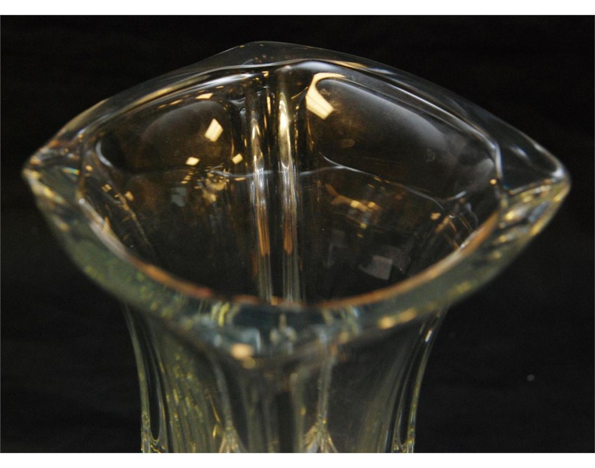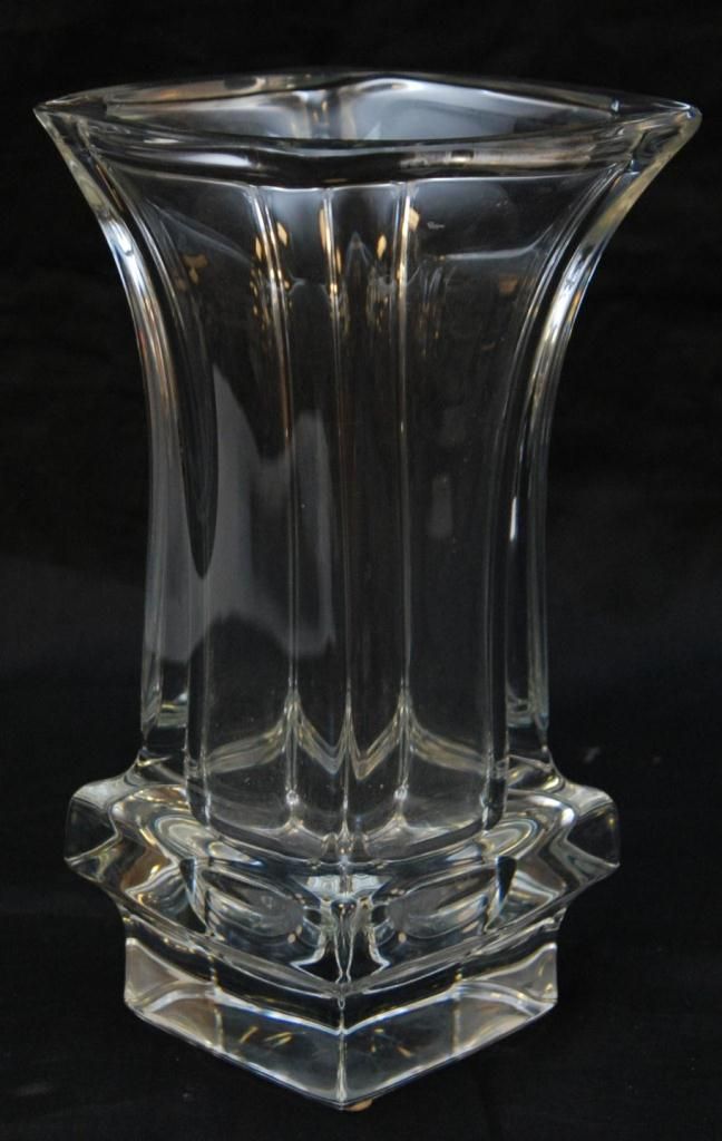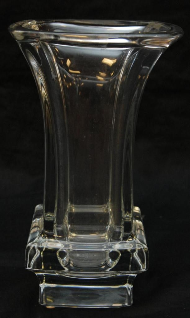 French clear crystal vase. Has round watermark with champagne glass to bottom. Mid to early 20th century. Measures 10 1/4" height x 6 1/4" width (26cm x 15.8cm). Total weight of 3229 grams.
