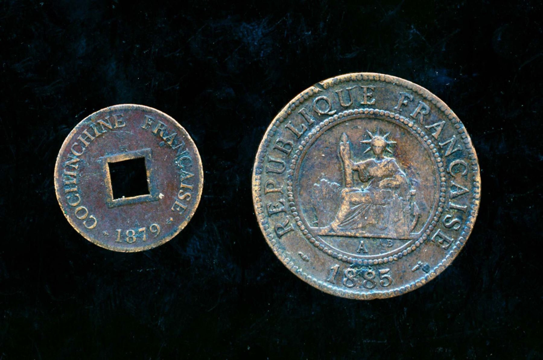 FRENCH COCHIN CHINA 1879-1885 Sapeque and 10 Centimes VF