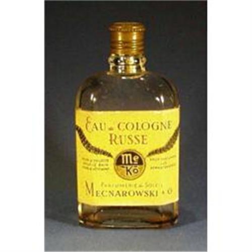Nice French Vintage commercial perfume bottle with original paper label and description : Eau de Cologne Russe - ME-KO. Brass cap is embossed and enameled with the same title ME-KO. French circa 1920's. Height : 5".