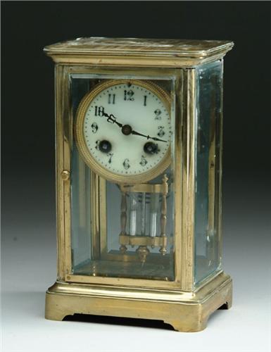 FRENCH CRYSTAL REGULATOR. The movement marked "Made in France 58441 with a Japy Freres and Co mark. Ivory dial with two keyholes and spring strike. Bevel glass surround. Mercury pendulum. SIZE: 8-3/4in. h x 5-1/4in. w x 4-1/4in. d. CONDITION: Case is good, wound tight. 9-26038