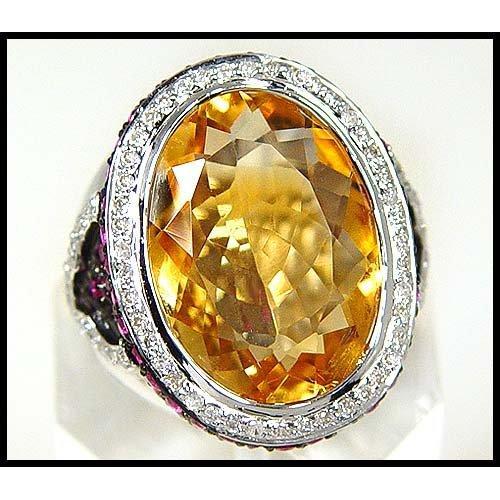 Henri Levys Museum Portfolio, owned by The San Francisco Jewelry Museum, featured this stunning ring. The design was faithfully created by a master goldsmith who took the long hours required to complete the ring. A 10.90 carat gem color citrine is set with 72 vivid natural rubies, and 70 full cut diamonds. As you can see, the combination is fabulous. The 18K white gold (13.71 grams) ring is size 7, but easy to change. It is 24mm (15/16") at the center. Valued by the director of the Museum at $2,900.