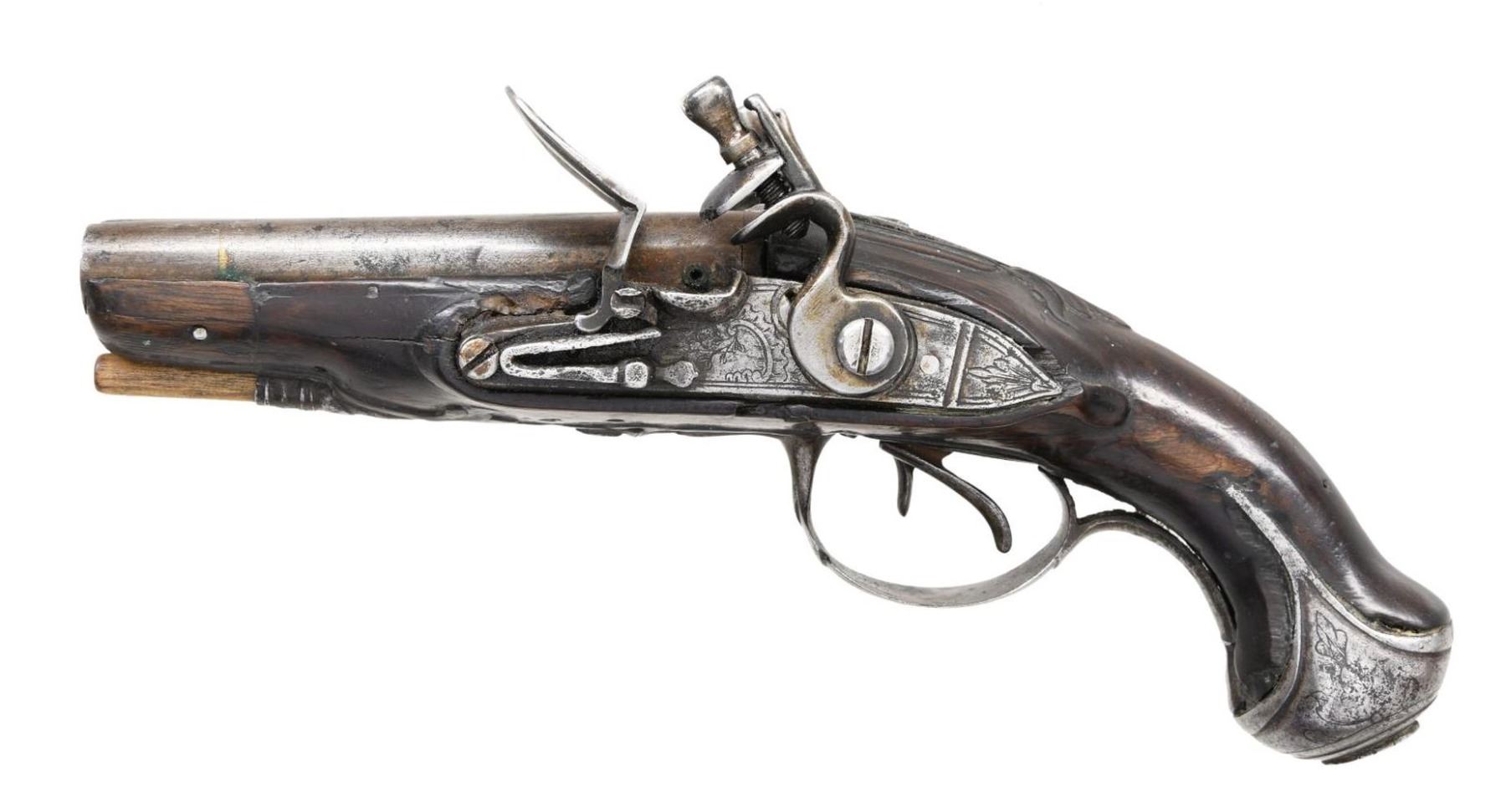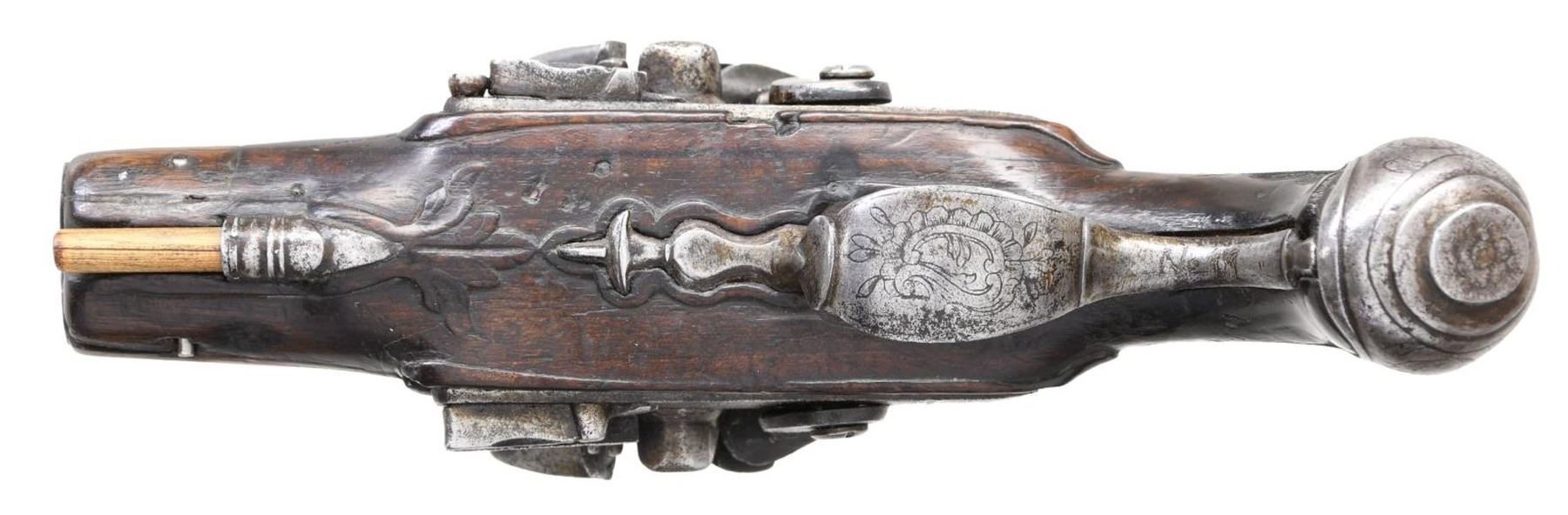 Cal. 40. S# NSN. Small, attractive, medium-quality pistol, 8" overall, with 4" unmarked barrels. Locks with deeply chamfered plates feature serpentine cocks, inset rounded pans, unbridled friction frizzens, and feather springs with flattened bulbous finials. Lockplates are engraved with line borders and acanthus highlights. Stock with a small knob grip extends to muzzles. Raised moldings around locks, trigger guard and ramrod channel. Raised, carved acanthus is behind the barrel tang and thimble. Iron mounts include a small, engraved grip cap with side spurs and a trigger guard with a spear finial. CONDITION: good. Metal parts were cleaned to a gray patina with silver highlights. The stock is fairly sound, with repairs at the muzzle and some replacement on the left side. Chips of wood are missing around lockplates. Bores are pitted. The right lock is operable; the left has replaced frizzen and cock. It will also not hold at full cock. (01-24409/MGM). ANTIQUE. $1,500-2,000.