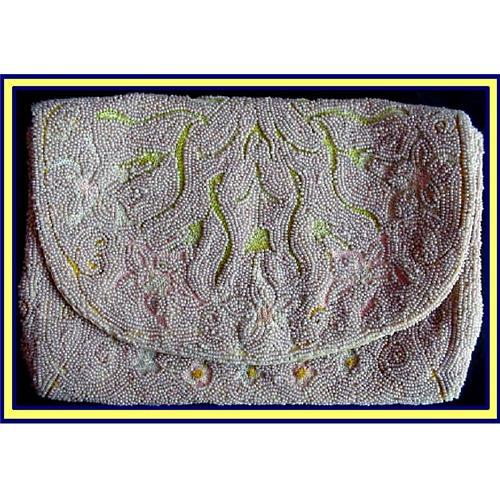 Early 20th century embroidered and beaded envelope purse / bag. Made in France. <BR>Measures 7 1/4inches accross.<BR>Envelope style bag with a press-stud close, in good shape. The entire surface is covered in tiny pale pink beads, like water pearls, with a few small gaps formed by embroidered flowers and leaves.<BR>From the top the leaves spread down, like wavy, green fingers. A ring of star-fish like pink flowers borders the flap of the bag. The underneath part has smaller, embroidered pink flowers with gold centers. The back of the bag has golden scrolls, pink, turquoise and green embroidered flowers and foliage. The inside of the bag has a pearly silk lining. There are a number of small holes, more or less confined to a line accross the fold of the bag. A pleated pocket contains a mirror. <BR>The pocket has a lable with red MADE IN FRANCE and the mirror has Corde-Bead in script.<BR>There are no beads missing and the embroidery is in very good shape with no losses. The bag might benefit from being cleaned and re-aligned on the right, where the fold needs tightening.