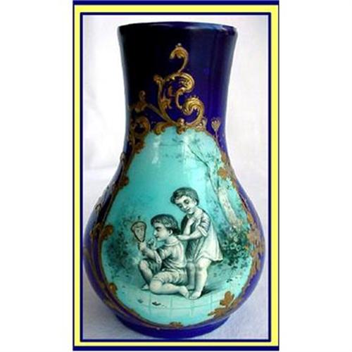 <table width="100%" border="0" cellspacing="0" cellpadding="4"><tr><td><em> </em></td></tr><tr> <td width="100%"> Enameled cabinet vase, France, possibly Limoges 19th century.<BR>Measures 4 1/4inches high. <BR>Metal with bright blue enamel. A central reserve in front is formed by wonderfully gilded flowers and scrolls that stretch all the way around the vase. The Reserve has a background of light/sky blue and depicts two outstandingly painted cherubs/children, looking into a mirror. Delicate flowers and trees behind them.<BR>No signature/marks.<BR>The painting and gilding are in very good condition. The darker blue enamel ground appears to have been restored near the top, since the colour is darker, as clearly shown in the photos. Otherwise, no damage of any sort. </td></tr><tr> <td> </td></tr><tr> <td>Reference #: 1918</td></tr><tr><td>Condition:See Description</td></tr><tr><td>Year:See Description</td></tr><tr><td>Title:FRENCH ENAMEL VASE CHERUB CHILDREN 19C GOLD</td></tr><tr><td>Location:Boca Raton</td></tr></table>