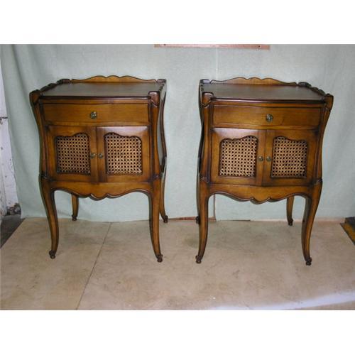 A FANTASTIC PR. OF FRENCH END TABLES OR NIGHT STANDS. EXTREMELY WELL MADE BY A CABINET MAKER, NOT MASS PRODUCED. THE FINISH IS ORIGINAL AND THE TABLES ARE STRUCTURALLY SOUND.