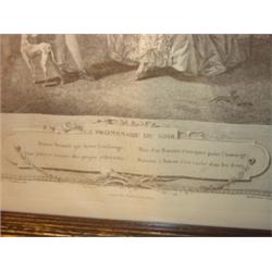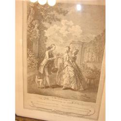 FRENCH ENGRAVING OF 18TH CENTURY COURTING SCENE. Depicts gentleman presenting flower to lady. Titled "A Promenade du Soir". 13.5" x 16.75" framed.
