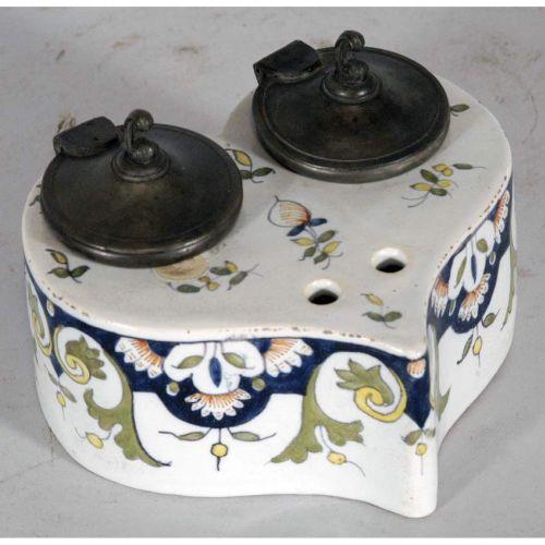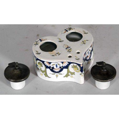 FRENCH FAIENCE INKSTAND, heart shaped, with original pots, CONDITION REPORT: chip under each ink pot- see images. PACKING AND SHIPPING: We offer packing (double boxed in most cases) and shipping of this item within the Continental United States by USPS or UPS (our choice- boxes over 30lbs or oversized may be recalculated based on buyer's location), NOT INCLUDING INSURANCE (it will be added when we know the sales price) for $20