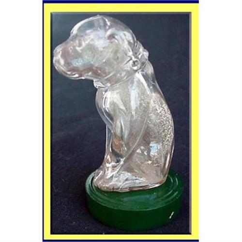 French Boxer dog figural glass perfume bottle. Made early to mid 20th century, France.<BR>A little under 3 inches high.<BR>Sits on a dark green plastic base, which also serves as the stopper. The opening is from the bottom.<BR>The glass dog, a Boxer, with studded collar and great features seems to be made of more than one layer of glass. There is clearly an inner and outer layer visible in on his back. The inner layer seems to be partially mottled - it's not clear whether by intent or via perfume residue.<BR>Bottle is not marked. <BR>Very good condition. No chips/cracks.