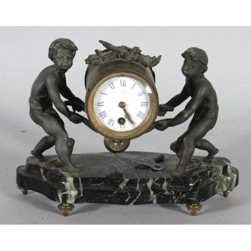 FRENCH FIGURAL MANTLE CLOCK, the movement supported on each side by a child, 8 1/4" high, circa 1910, CONDITION REPORT: face of clock with hairline cracks, figures with patina loss. PACKING AND SHIPPING: We offer packing (double boxed in most cases) and shipping of this item within the Continental United States by USPS or UPS (our choice- boxes over 30lbs may be recalculated based on buyer's location), NOT INCLUDING INSURANCE (it will be added when we know the sales price) for $35