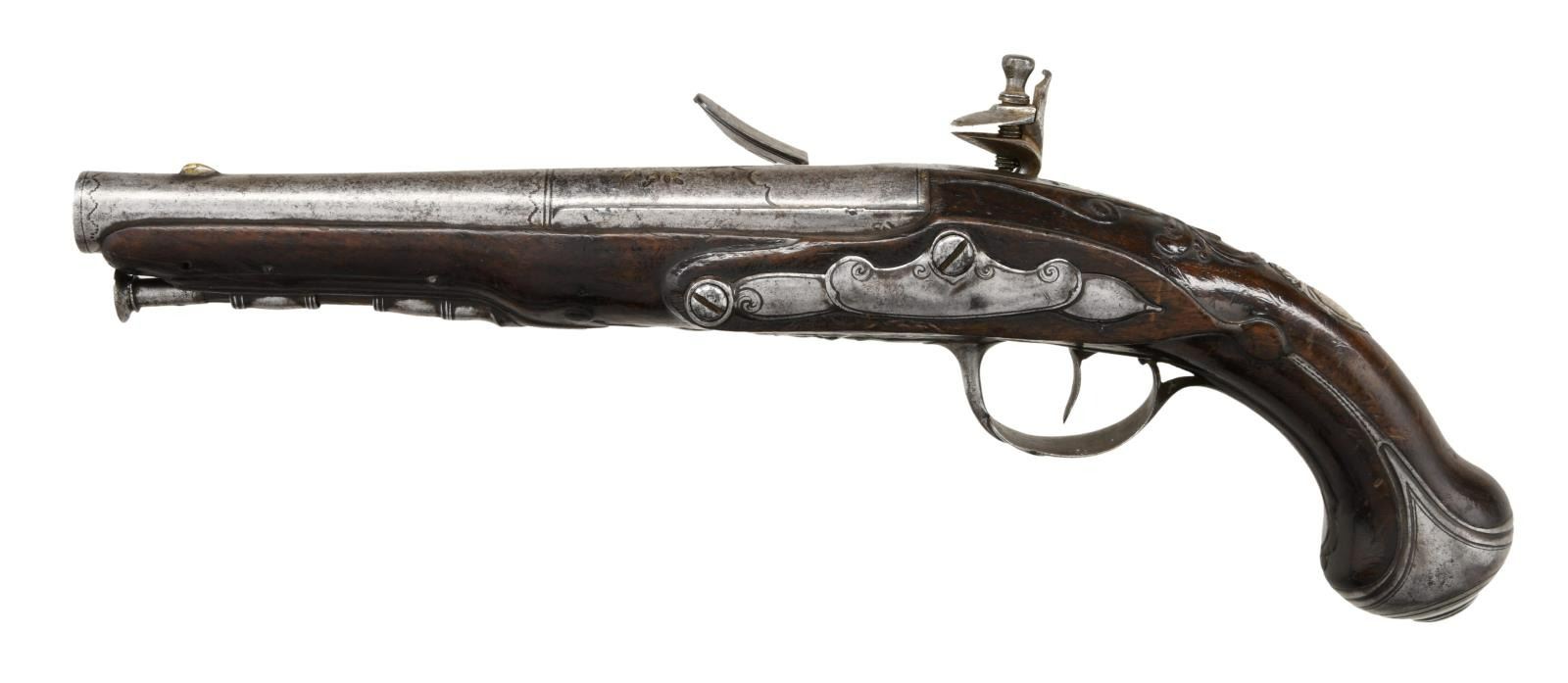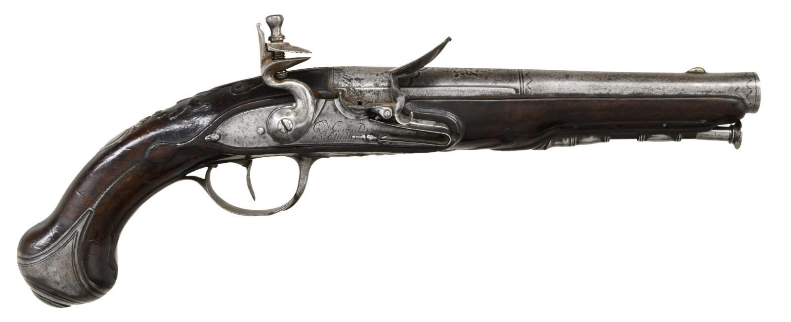 Cal. 59. S# NSN. The 7-3/8" iron barrel transitions to round and is swamped behind flared muzzle. There is some decorative foliate engraving with remnants of gold wash. Round bodied lock with serpentine cock has nicely filed teat at rear and is fitted with inset rounded pan, bridled friction frizzen and feather spring with fancy steeple type finial. Lockplate is signed "Cde. Coignet" "a" "St - Etienne" (there were three gunmakers named Claude Coignet working in St - Etienne at the time this pistol was made Circa 1750-1810). Dark European walnut stock extends to within a 1/4" of muzzle and is pinned to barrel. There are raised acanthus carvings behind barrel tang and mouldings around lock, sideplate, trigger guard and ramrod. Pistol is iron mounted with knob grip cap having side spurs, relief filled trigger guard with vase finial and extended one piece sideplate. A silver crest plate is at top of grip. Baleen ramrod with steel tip and worm tail mounts through single beaded pipe and matching thimble. CONDITION: good. All iron parts show cleaning to pewter gray with overall light pitting. Wood exhibits old finish with many marks and dings and does not appear to have any major flaws but does show repaired crack on left side toward muzzle. Bore is pitted. Lock is operable, actually quite good. (01-24074/MGM). ANTIQUE. $1,200-1,800.