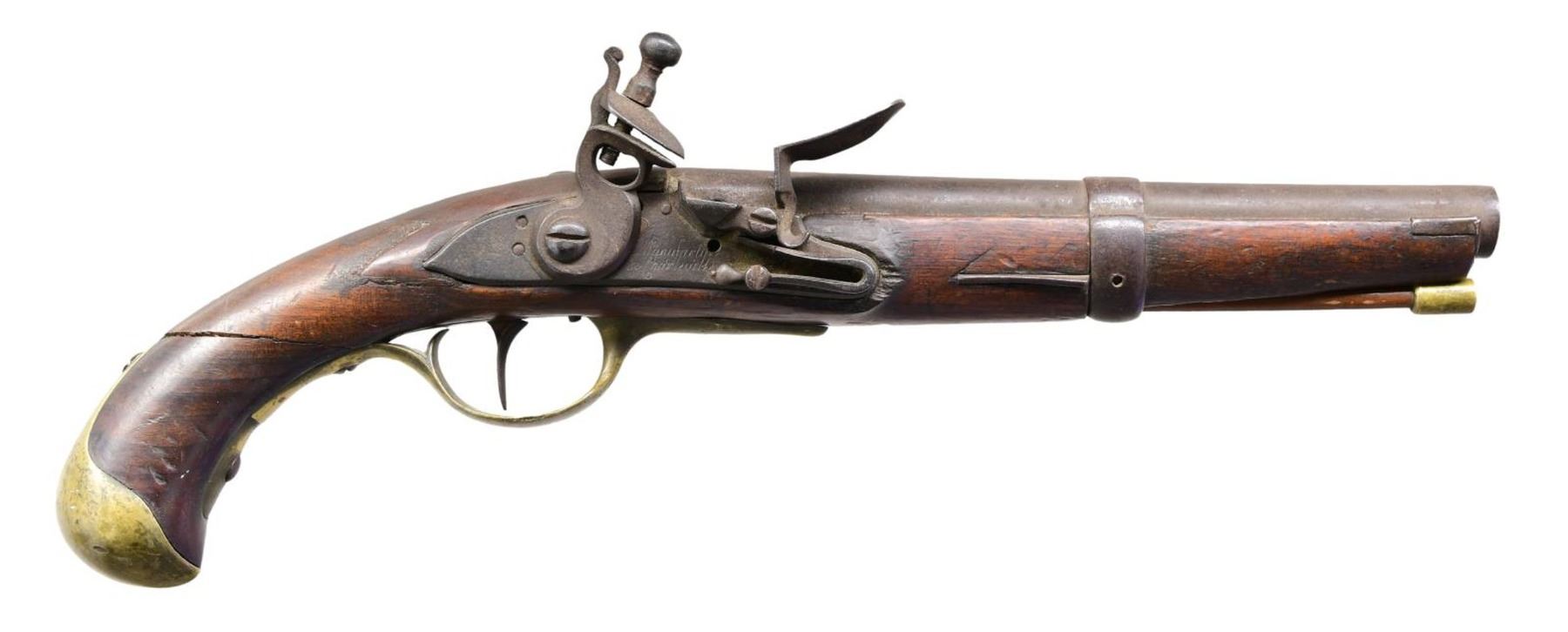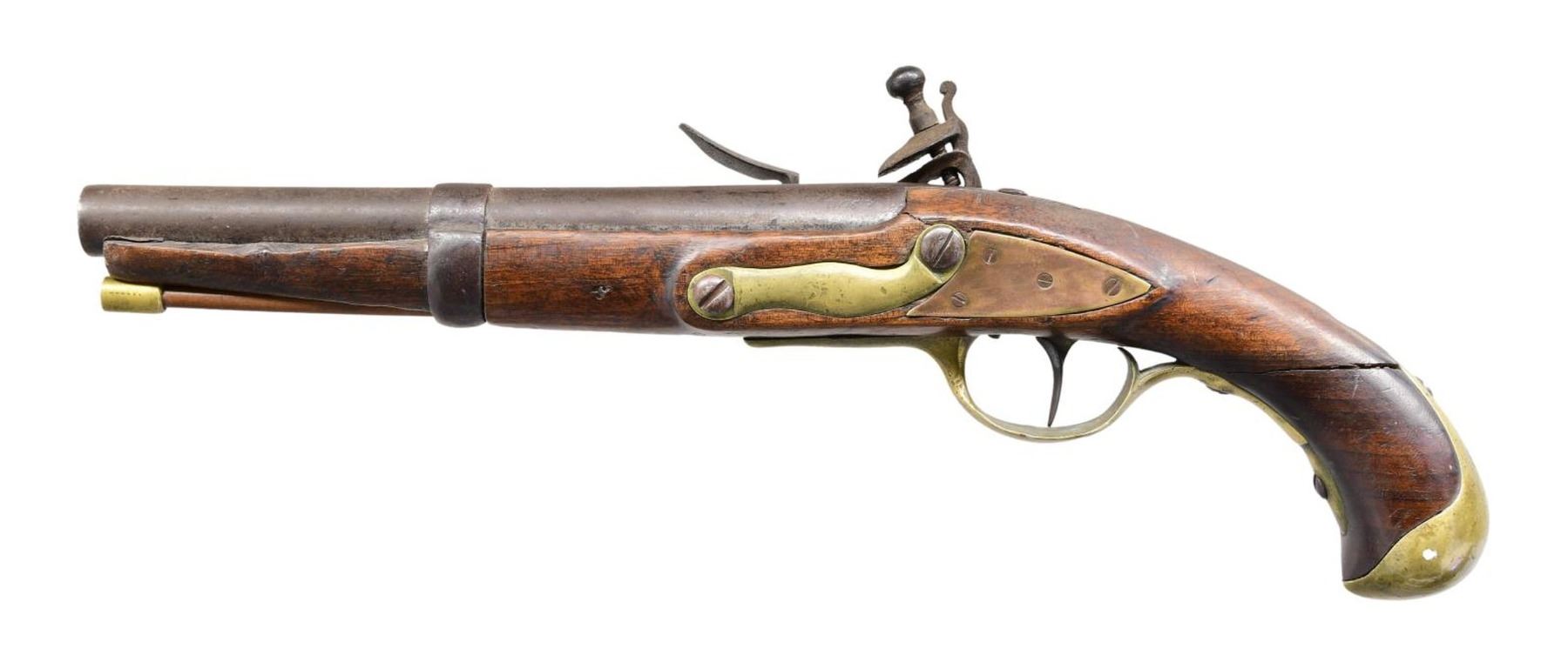 Cal. 69. NSN. Bbl. 9". Pistol lacks sights. Lock marked "Manufacture de Charleville". One of the lock pins appears missing. Rear left of bbl. marked "DY76". Hardwood stock w/ brass furniture & one band. Hardwood ramrod w/ brass tip. CONDITION: stock has screw repair to extensive wrist cracks, a brass repair on left side, two other large repairs near lock, a long crack on underside behind band, scattered chipping, dings & handling wear. Brass parts are a dull yellow patina w/ oxidation & dings. Balance of metal is a dull gray oxidized patina w/ scattered pitting. Lock is functional when hand cycled. Oxidized bore. (01-25268/MJC). ANTIQUE. $600-1000.
