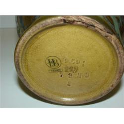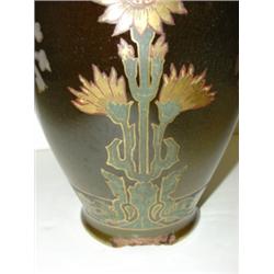 FRENCH FLORAL & GILT DECORATED VASE. Marked on bottom "HB-France". Large chip along the bottom rim. Minor wear to gilt. 9.5" H, 6" Dia.