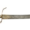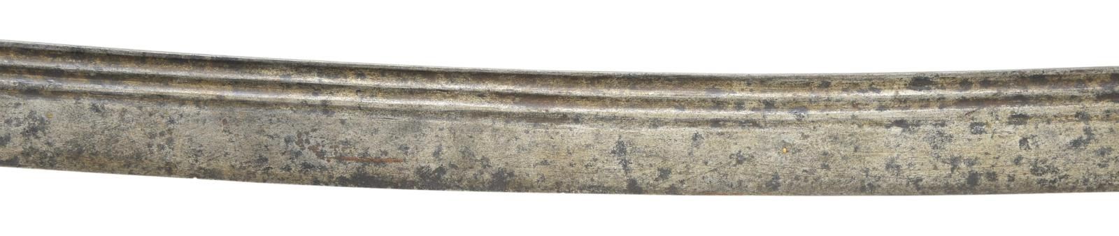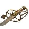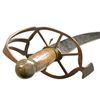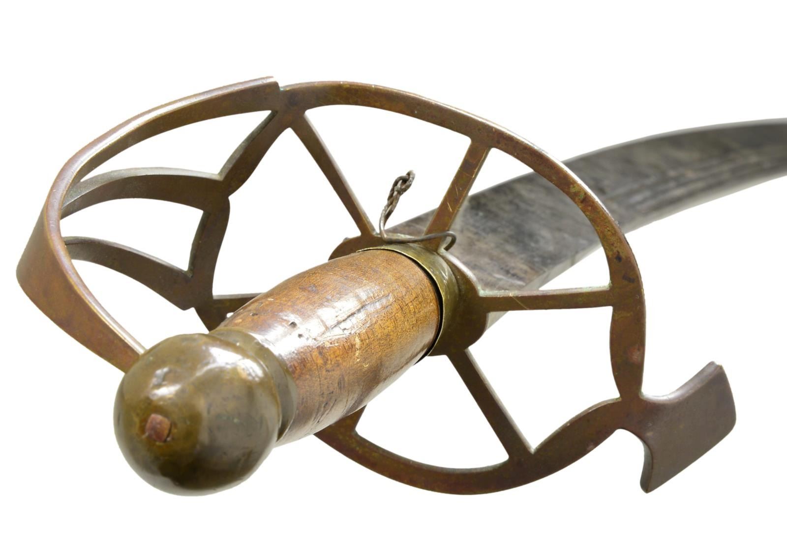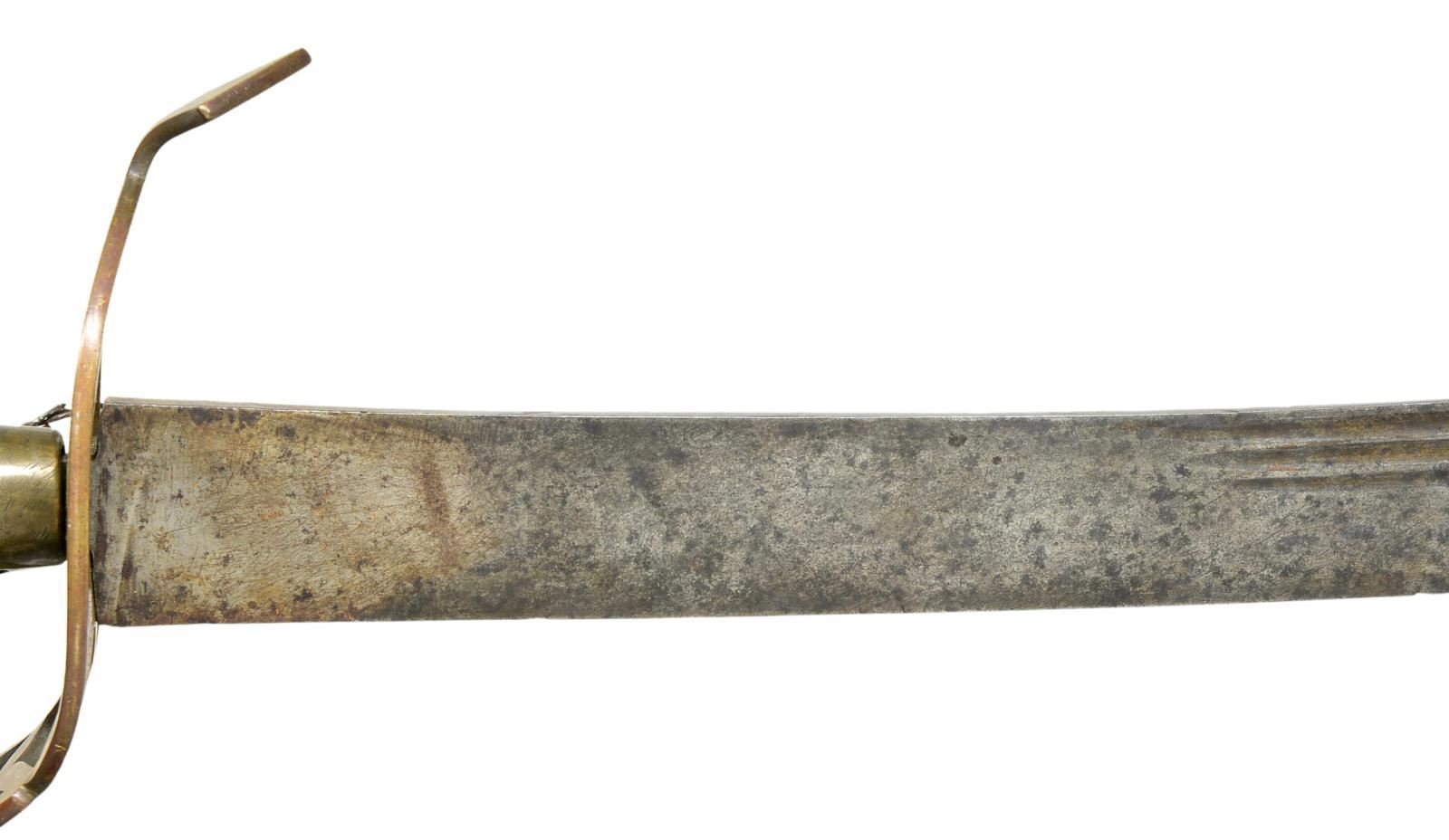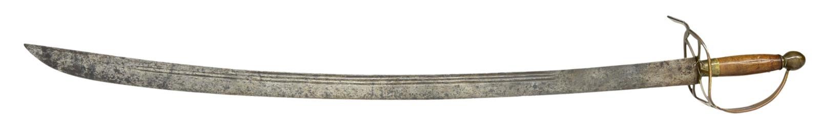WHEEL DRAGOON SABER. Overall length: 39 1/8". Blade length: 33 1/2". A triple fullered curved blade typical of early blades imported to this country from Europe. The brass hilt is in wagon wheel form having 6 spokes at the base w/ an arrowhead shaped quillon. Rising towards the pommel is a 3 branch knuckle bow joining into a single branch. A well formed ball pommel flares & tapers forming the top of the grip. There is a lg. 7/8" slightly tapered brass ferrule that forms the base of the grip. The grip is of smooth wood w/ a sm. nail imbedded on the inside. No scabbard. Research has suggested that these swords could have been made by Richard Manning, 1701-1774 of Ipswich, Massachusetts. Manning was a clock maker known to have produced brass gears w/ the same 6 spoke design. Manning served as the Artificer of the Ipswich Regiment during the French & Indian Wars & is also known to have made swords for the militia of Andover, MA. CONDITION: blade has a medium gray lightly mottled patina w/ a scant few very shallow nicks to the edge. The brass hilt, pommel & ferrules have a pleasing deep mellow mustard patina. The wooden grip has some wear to the surface. (02-14916/BF). $6,000-8,000.