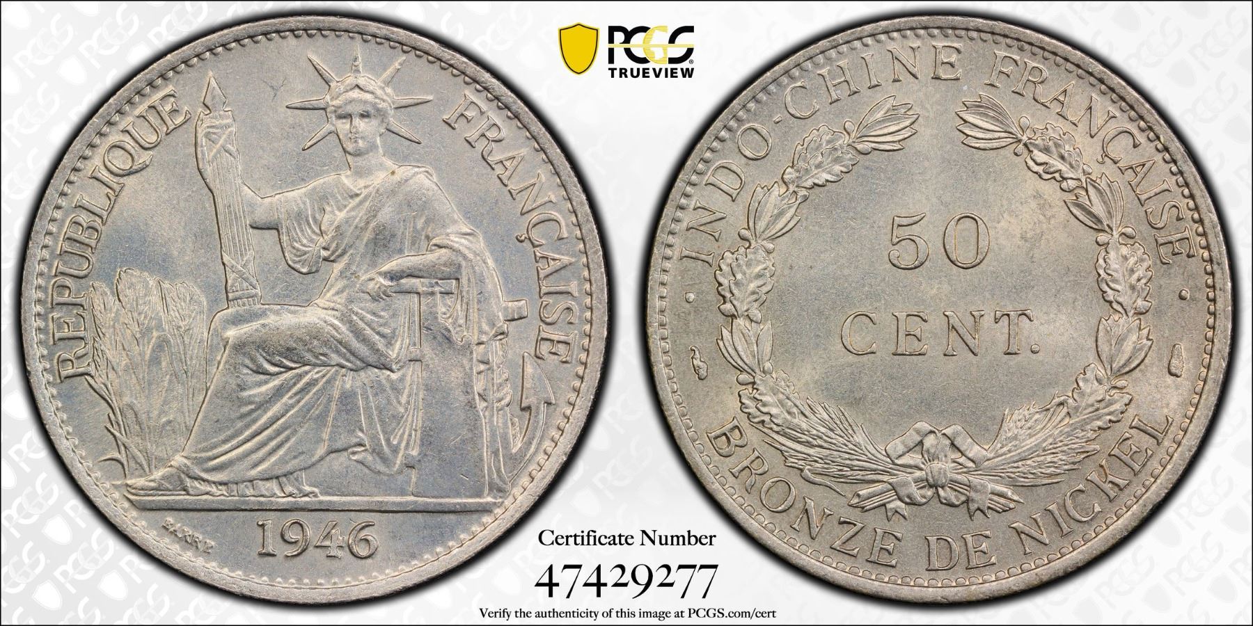FRENCH INDOCHINA: 50 centimes, 1946, KM-31, Lec-265, beautiful luster, an excellent example for this type, PCGS graded MS65.