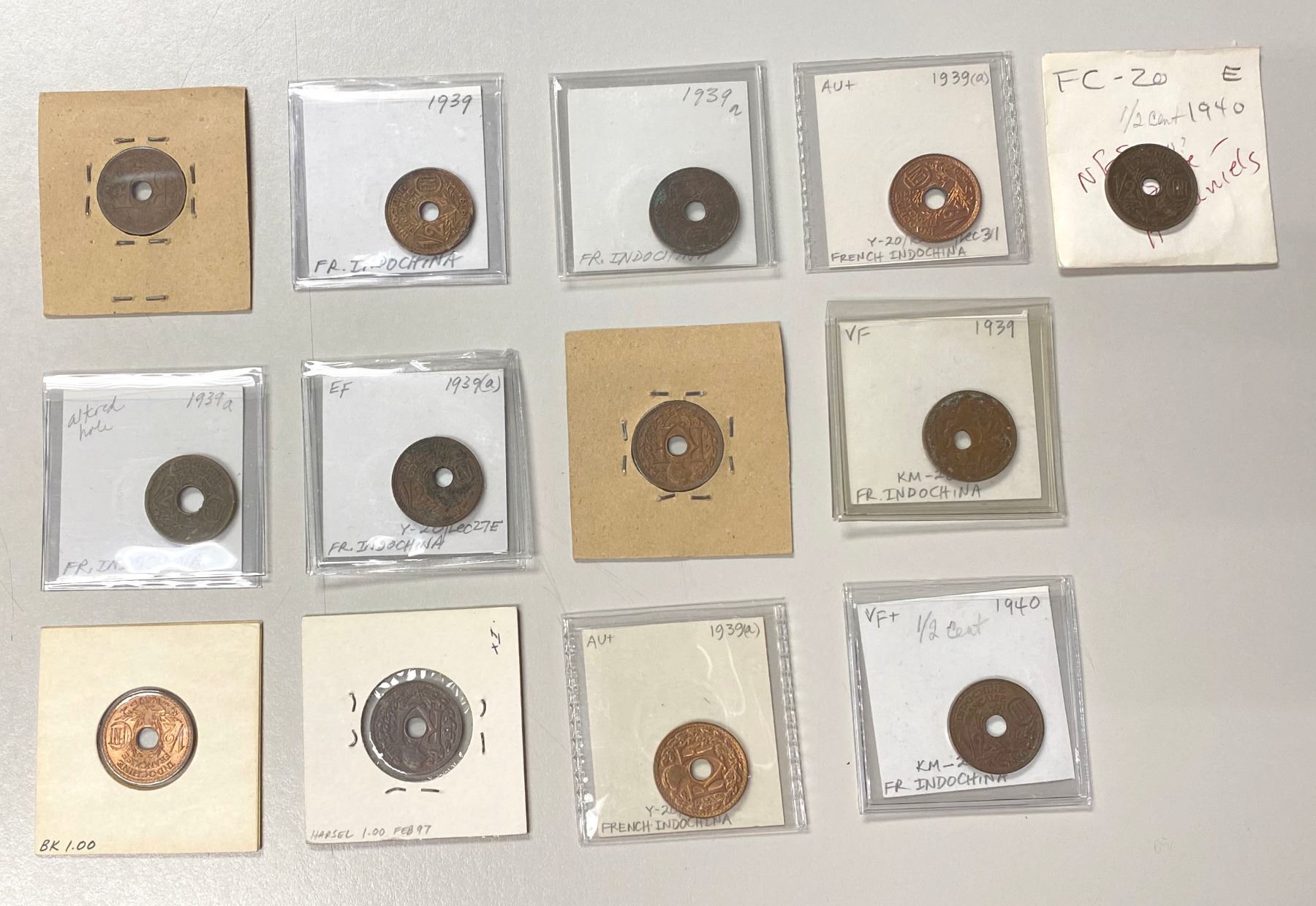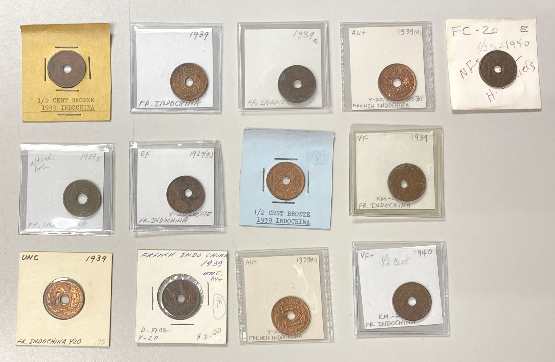 FRENCH INDOCHINA: LOT of 13 coins, all AE ½ cents, including 1939 (11 pcs, including one with center hole off-center) and 1940 (2); average circulated grades, with many uncs, in consignor's 2x2 holders, viewing recommended; retail value $550, lot of 13 pieces, ex Howard A. Daniel III Collection.