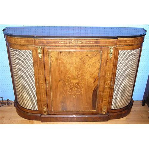This is an absolutely outstanding console with ornate inlays in exotic woods. The top of the console is rosewood with intricate graining and a black trimmed edge. The front and curved sides have wonderful french inlays and pencil inlays of varying thickness. There are ornate brass accents and trim all over this piece. The curved side doors feature a draped wood panel with an overlay of 1/2" square grating which is very unusual. The grating has chain link type pinches at each criss cross. The inner edges of the doors are trimmed in black. The doors open to reveal 2 shelves within.