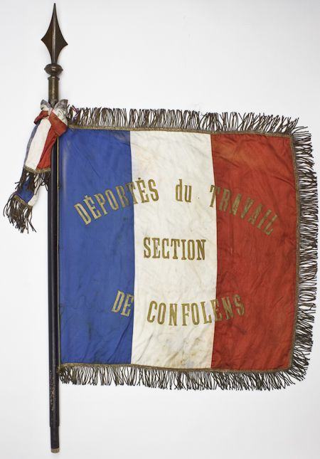 Ornate double-sided rayon French flag assembled in three pieces, 23" x 23" with gold fringe, bearing printed gilt lettering (translated): "LABOR DEPORTEES CONFOLENS SECTION". The flag is attached to a wood pole topped with an ornamental brass spearhead and also bears a tricolor gold-fringed ribbon and bow. The flag bears some large stains at bottom and the ribbon has faded a bit, yet still it remains an appealing item. This flag was undoubtedly displayed at an area in which forced labor deportees were sorted prior to transport to Germany. Of course, its attractiveness and quality were intended to give a false sense of security to those headed for work camps and factories in the Third Reich.