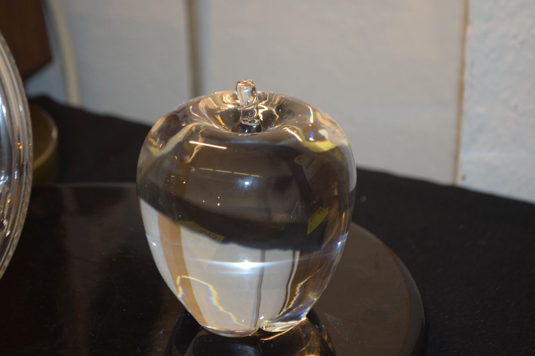 FRENCH LALIQUE CIRCULAR ASHTRAY, THE BOTTOM W/DESIGN OF A SAILING SHIP, BASE MARKED LALIQUE FRANCE (6 3/4") & STUEBEN CRYSTAL APPLE (2 PCS)