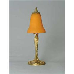 Lot 1267 FRENCH LELEU LAMP. Wonderful Leleu boudoir lamp has highly stylized foot with thistle leaves and stem running up the base to a raised three-dimensional thistle flower. Base supports beautiful orange bell shade with random dark flecks. Shade is signed on side with etched signature "Daum Nancy" with Cross of Lorraine and the base is signed on foot "G. Leleu". SIZE: 17-3/4" t. CONDITION: Very good to excellent. 5-70111 (1,500-2,000)