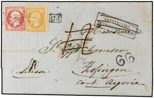 1867 (Apr 22) Cover from ALEPPO to SWITZERLAND franked by France 1862 40 c. vermilion & 80 c. rose tied by 5079 gros chiffres. Black PD alongside and framed AFFRANCHISEMENT-INSUFFISANT erased in manuscript with 12 cent charge erased. Unusual 66 handstamp at right and arrival cds on reverse of fine to unusual destination. Scott 27, 28.